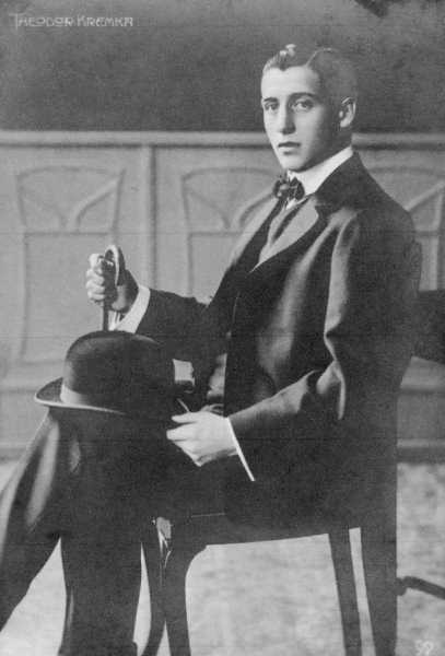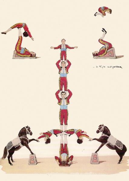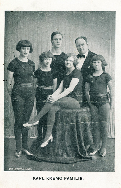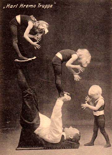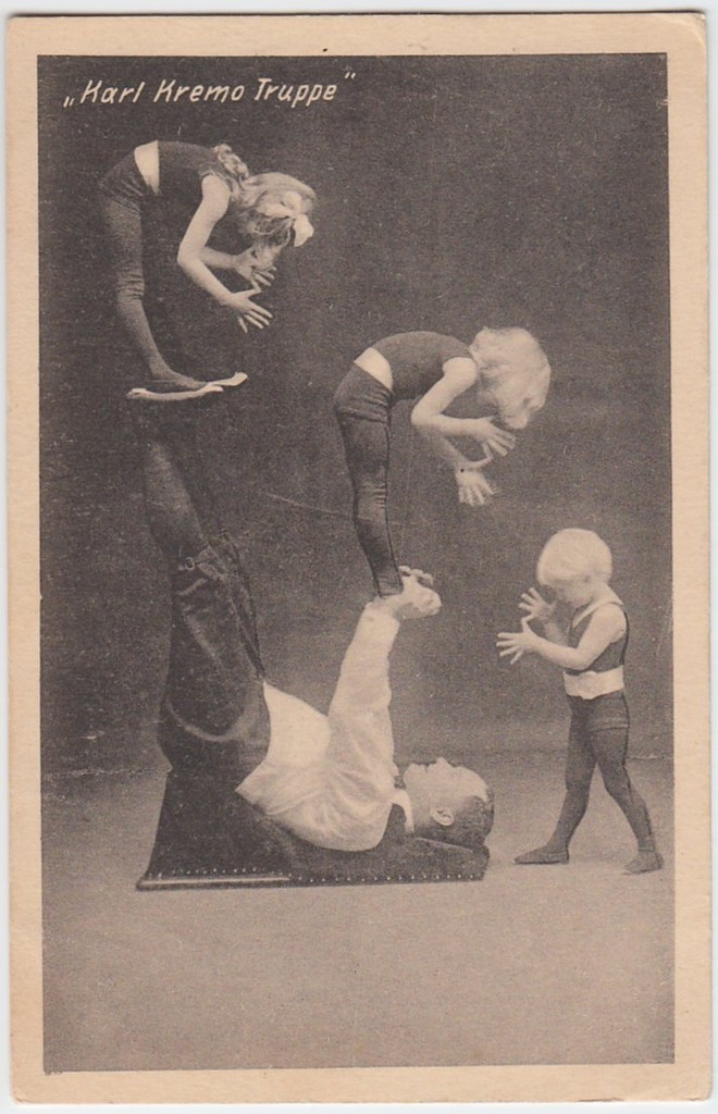 The Kremo's were widely known in their trade as specialists in the "Risley Act", also referred to as icarists, where one acrobat juggles another acrobat with his feet. The Kremos produced two generations of remarkable icarists. The original Kremo troupe was created c.1880 by Josef Kremo (1854-1917— real name: Kremka, of Czech origins), with at least two of his older sons, Sylvester and Karl. Josef Kremo had been trained by the Schäffers, an Austrian family of acrobats and the most prominent Risley act of the late 19th century. Josef and his wife, Austrian-Hungarian equestrienne Franzisca Allinger (1858-1940), had thirteen children, twelve of whom eventually participated in the family's Risley act; at least three of them, Anton, Franziska, and Viktor, could perform a triple somersault on the feet of their father. Sylvester, Josef's eldest son (1881-1962), and Karl, his younger brother (1882-1958), continued the family tradition, each with his own troupe. The Sylvester Kremo Family troupe consisted of Sylvester and his daughters, Sylvia and Selna. More important, the Karl Kremo Family consisted of Karl, his brother Mark (1888-1945), his wife Margrit (1891-1923—born Hanus in Hungary), and their children, Bellona, Béla, Bianca, and Bert, along with occasional partners. The Karl Kremo Family brilliantly continued the Kremo tradition, performing in Europe's leading circuses and variety theaters until the 1930s. One of Karl's sons, Béla Kremo, later became a world-famous juggler, as did Béla's son, Kris Kremo. When Theodor mailed the postcard in 1910, the Kremo troupe |