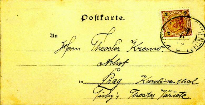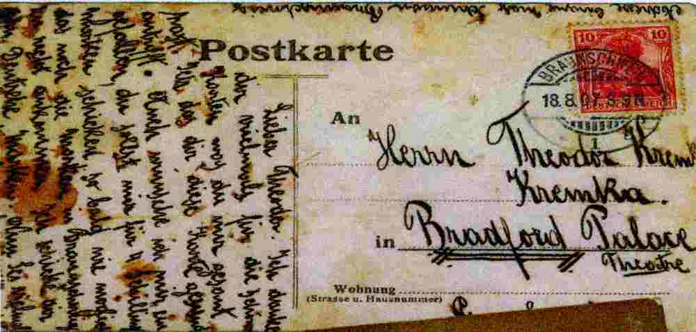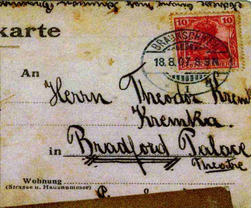 mailed to Theodor Kremka at Bradford Palace Theatre Bradford, England on August 18, 1907 by Elvira "Ella" Kremo from Braunschweig, Germany |