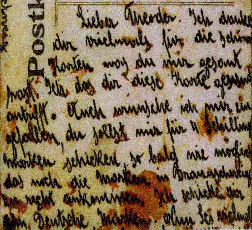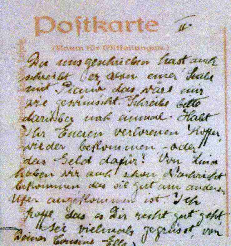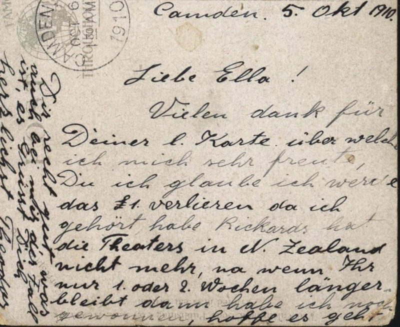 The Rickard referred to in the card was Harry Rickards, who owned the Tivoli Theater in Sidney and had other theaters operating under the Tivoli name in Australia and elsewhere. In 1911, the year of his death, Rickards was described as 'the largest single-handed music hall manager and proprietor in the world'. Born in England, Rickards was a music hall performer who, after relocating to Australia, went into the theater business in 1892. From 1895 on, he went overseas annually, visiting music-halls in search of performers. He brought the cream of variety artists to Australia: acrobats, ventriloquists, instrumentalists, impersonators, singers and animal acts, including the legendary Marie Lloyd, Little Tich, Houdini, the quasi-Chinese conjuror Chung Ling Soo and Paul Cinquevalli, the unrivalled juggler. When translating, Hartmut did not recognize the "£" symbol for British pound currency. On the night of October 20, 2012, Anastasia Andronova e-mailed scanned images of the postcard and Hartmut's translation to Phil Cohen in Camden, New Jersey. She also asked him about "the strange character in front of the numeral 1". On examination he recognized the British pound symbol. "Lose the 1" obviously was "Lose the 1 pound" and referred to a bet that Theodor had with Elvira Kremo regarding the length of time the Kremo family act would stay in Australia and New Zealand. Phil amended Hartmut's translation as follows: Dear Ella Many thanks for your lovely postcard about which I was very happy. Hey you, I think I will lose the one pound, since I have heard Rickard does not have the theaters in New Zealand any longer. Well, if you just stay for one or two more weeks, then I will have won. Hope your are fine, I'm fine too. Regards … Theodor continued below |