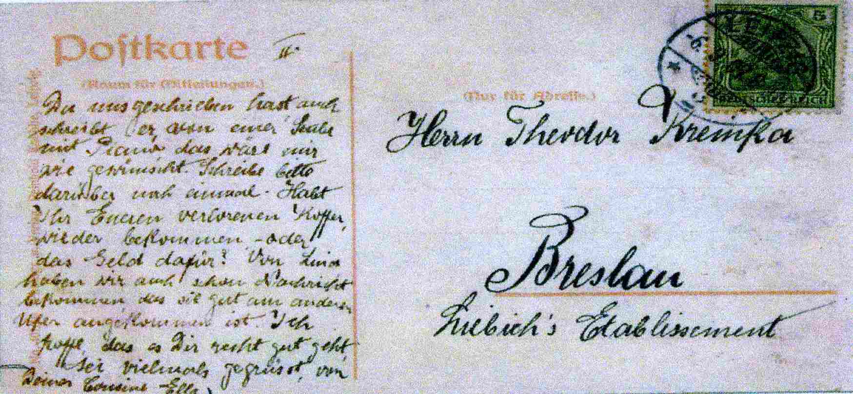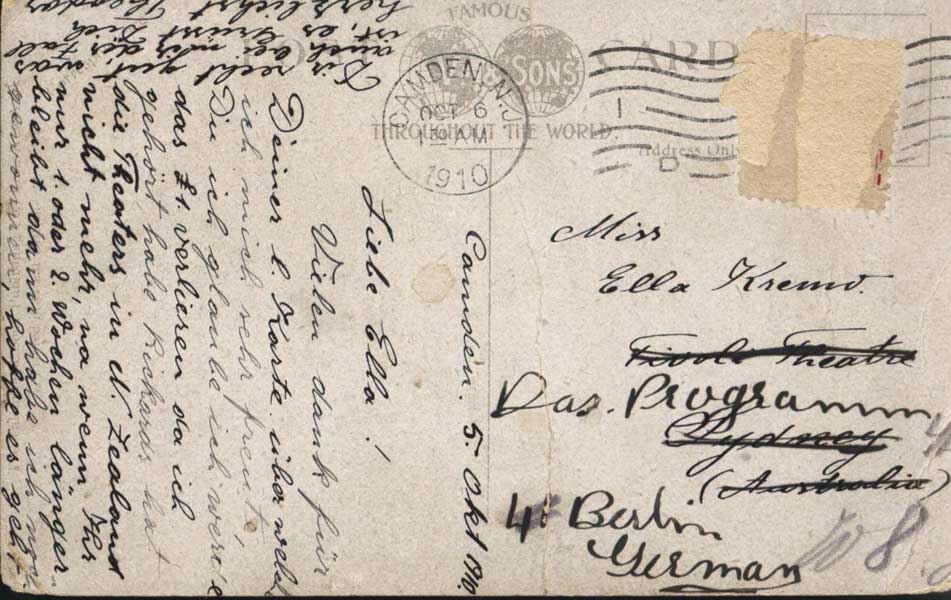 The postcard above was mailed on October 5, 1910 from Camden, New Jersey to Miss Ella Kremo at the Tivoli Theater in Sydney, Australia. When the postcard arrived in Sydney, Miss Kremo and her family, a troupe of acrobats who appeared on stage around the world, had left, leaving a forwarding address of Das Programm in Berlin, Germany. Postal authorities sent the card to Germany. The address given was insufficient, the card was never delivered, and it lay, unclaimed, in the post office in Berlin Germany until the spring of 1945. continued below |