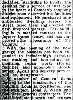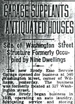 In 1935 Issie Brody opened a car wash and detailing shop, an “auto laundry” in the parlance of the day, at 540 Washington Street, where he also stored vehicles and performed oil changes and lubrication. As time went by he acquired a total of nine properties on the other side of Washington Street, and in 1939 had built a new garage where he repaired cars and sold Esso gasoline. The new garage, at 527 Washington Street, opened in January of 1940. By 1947 Issie Brody moved to an apartment over a ladies hats store at 403 Broadway, a short walk from his business, with wife Molly and son Ormon Brody. 403 Broadway then sat between Wallen's Jewelry and gifts at 405, and Leo's Appliances and Jewelry at 401.