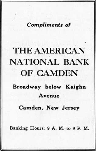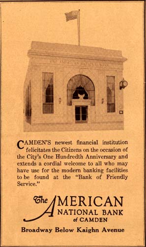 Founded in the mid-1920s, The American National Bank built a fine building at 1213 Broadway which is still standing today, although it has been boarded up and vacant for many years. The bank's President was Elmer Ellsworth Long, who had been a principle in the Munger & Long Department Store at Broadway and Federal Street for many years. Another director was Louis Waisban, who owned a grocery and had real estate interests in Cramer Hill. The American National Bank merged with the Camden Trust sometime after February of 1936. It remained open as a branch of the Camden Trust, and its successor, the Bank of New Jersey, until at least 1977. The building was added to the National Register of Historic Places in 1990. |