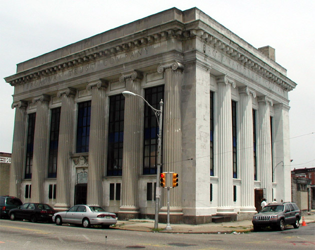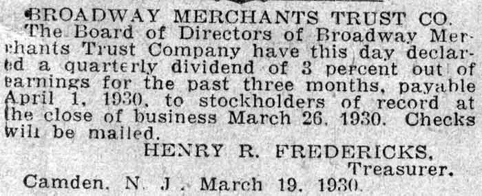 The Broadway Trust Company building was built prior to World War I. The architect was Phillip Merz who was based in Rochester NY and the building was constructed by the J. Henry Miller Co. of Baltimore MD, who also built the building which would become the Bureau of Engraving and Printing's third home in Washington DC, and the Bank of America Building in Baltimore MD. The Broadway Trust Company was led by John J. Burleigh, one of the leading businessmen in South Jersey from the 1870s through World War I. William J. Cooper, who owned a business at 215-221 Kaighn Avenue selling doors windows and moldings, served as one vice president; the other was Anthony Kobus, who was in the shoe business at South 4th and Spruce Streets. Adam Schlorer, the owner of a large meat business at South 8th & Chestnut Streets, was also one of the original organizers. According to the city directories John J. Burleigh was president of the bank through 1916. Anthony Kobus succeeded him until he passed away in 1920. Later principal officers included Judge John B. Kates and Cramer Hill bottler John Schimpf. Also connected with the bank during the 1910s was T. Yorke Smith. On October 5, 1920 Broadway Trust's bank messenger, David S. Paul, mysteriously disappeared while carrying tens of thousands of dollars worth of cash and securities. His body was found on October 16 at Irick's Crossing, near Tabernacle in the New Jersey Pine Barrens. He had been kidnapped, murdered and robbed by two acquaintances, Frank J. James and Raymond Schuck, who were tried and convicted of his murder. They were executed in New Jersey's electric chair on August 30, 1921. During the 1920s a series of mergers occurred among the smaller banks of Camden. The relatively small Broadway Trust attempted to keep pace with its larger competitors by absorbing the Merchants Trust, a small bank at Broadway and Carman Street that catered to Camden's business community. By 1927 a small satellite branch was open at Mount Ephraim Avenue at Jackson Street. However, after the stock market crash of 1929 as the country slipped into the Depression many small banks failed across the country. The Broadway Merchants Trust survived 1930 as evidenced by the stock certificate shown below but closed shortly afterwards. The building hasn't functioned as a bank since it closed. In recent years it has been used as a church. It was added to the National Register of Historic Places in 1990. |