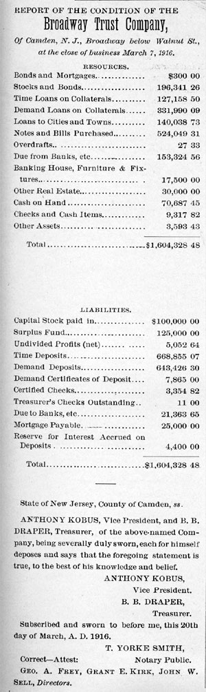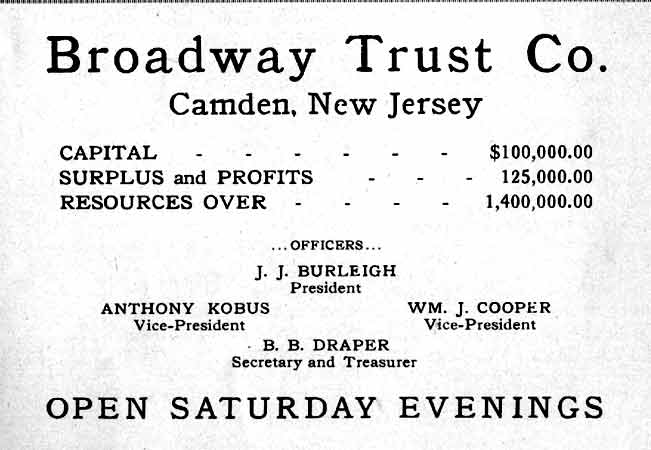 Donges - Lewis Starr -Harry M. Schierer Patrick H. Harding - Robert J. Kearns - William Morgenweck - Isaac Van Sciver H. Schoemer - Julius Burman - Solis D. Cohen - William T. Boyle - Francis D. Weaver Walter R. Carroll - Joseph H. Carr - E.E. Read Jr. - Camden Lodge of Elks Broadway Merchants Trust Company - Church of the Immaculate Conception |