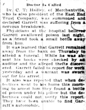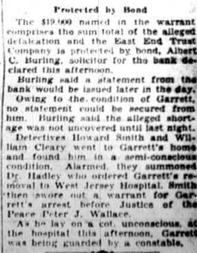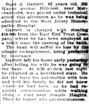 EMBEZZLER JOKES WHEN TAKEN TO COUNTY PRISON Laughing at photographers who tried to snap a picture as he covered his face with his hat and joking with the officers who accompanied him, Burd S. Garrett, for seven years a teller employed by the East End Trust Company was taken from the West Jersey Hospital this morning at 11:15 to the County Courthouse. When arraigned before Justice of the Peace Peter J. Wallace in the office of Lawrence T. Doran, chief of county detectives he waived reading and hearing of the complaint charging him with embezzlement of $19,000 of the bank’s funds. Less than ten minutes after he had entered Chief Doran's office, the confessed embezzler, accompanied by Detective William Cleary, reappeared and walked to the county jail where he was committed . Prosecutor Ethan P. Wescott did not attend the arraignment and it was expected that he would set Garrett's bail sometime this afternoon, when he would announce his intentions as to presentment of the case to the grand jury. Garrett, who according to Assistant Prosecutor Joseph A. Varbalow admitted manipulation of the bank funds, which he lavished on his wife and the six children he had instructed from birth in the principles of honesty, appeared unmoved this morning by the proceedings. His face has regained the color it had lost when detectives first began questioning him, as he lay in a coma on a cot at the hospital last Saturday. Since Sunday afternoon, when he broke down and admitted the charges against him, he has chatted with his constable guard. Garrett’s appearance today was that of a businessman in comfortable circumstances. He was well dress, in a gray suit, dark overcoat, and wore a light gray soft felt hat His eyes, behind tortoise shell glasses, were bright, and minus the stare of three days ago. His wife, despite his reported confession reiterated her belief today that “it can’t be true.” Firmly declaring that she used economic measures in her housekeeping |