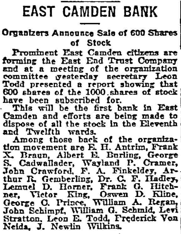 The East End Trust Company was first organized on May 26, 1905. Dr. C.F. Hadley was the first president. Other founders and early directors included John Schimpf, Frederick von Nieda, and John Crawford. The East End Trust Company opened for business on July 1, 1920 in temporary quarters at 27th and Cramer Streets. Dr. C.F. Hadley was again the president. The cornerstone for the East End Trust Company's new building at 2614-2616 Federal Street, designed by architect Joseph Hettel Sr., was laid on September 24, 1921. By 1936 the East End Trust had merged with the Camden Trust. |