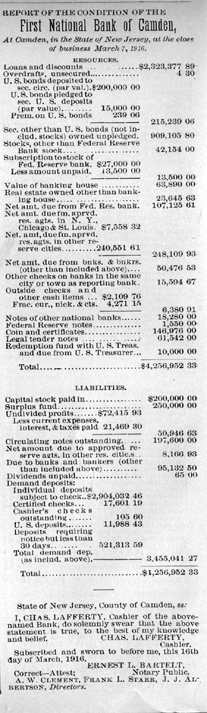 The First National Bank merged with the National State Bank of Camden under the name First National State Bank on July 1, 1922. |