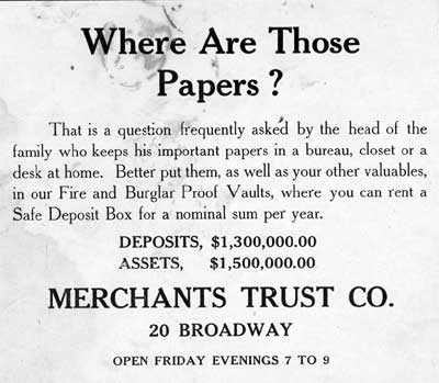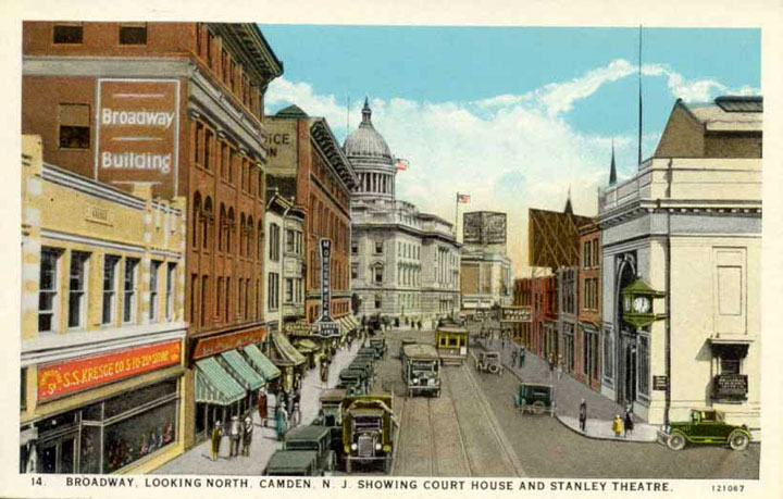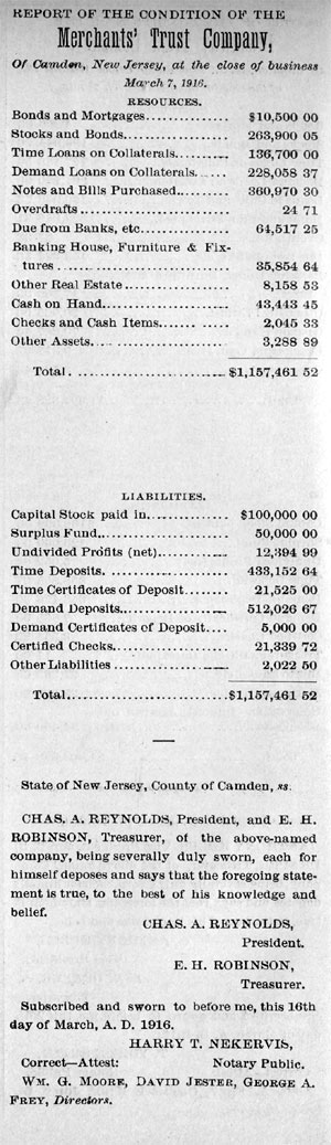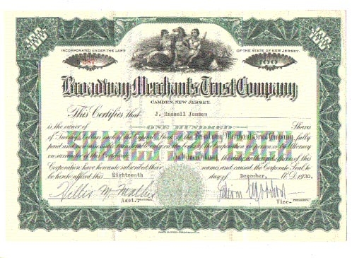 The Merchants Trust was organized in November of 1911. It was a small bank that catered to Camden's business community, and was one of many small and medium sized banks active in the 1910s and 1920s. From its founding through his death in 1924 the president of the Merchants Trust was Charles Reynolds. He was succeeded in that position by George Frey. E.G. Robinson served as vice-president all through this time. The new bank acquired the house of Casper T. Sharpless at 18 Broadway, and remodeled it for use as a bank. The Merchants Trust opened its doors for business on March 4, 1912. The Merchants Trust enjoyed great success in the years leading up to World War I, and in October of 1917 construction began on a new building, next door at 20 Broadway. Due to war-time conditions construction was delayed, and it was not until March 24, 1919 that the new Merchants Trust bank building was occupied. The directors were all prominent Camden businessmen and included lumber merchant H.B. Coles, former mayor Joseph E. Nowrey, Joseph H. Forsyth, Francis B. Wallen, E. G. C. Bleakly, Elmer E. Long, Frank Hineline, Charles A. Reynolds, William G. Moore, and Highland Mills president Charles S. Boyer, who is best remembered today for his writings and work as an early president of the Camden County Historical Society. James J. Scott, a partner in the metal-working firm of Strandwitz and Scott and a prime mover in the community based effort that resulted in the construction of the walt whitman hotel was also involved. During the 1920s, a series of mergers occurred among the smaller banks of Camden. The relatively small Broadway Trust attempted to keep pace with its larger competitors by absorbing the even smaller Merchants Trust, which for 1927 had only reported $645,000 in assets. After the stock market crash of 1929, as the country slipped into the Depression, many small banks failed across the country. The Broadway Merchants Trust survived 1930, as evidenced by the stock certificate shown below, but closed shortly afterwards. |