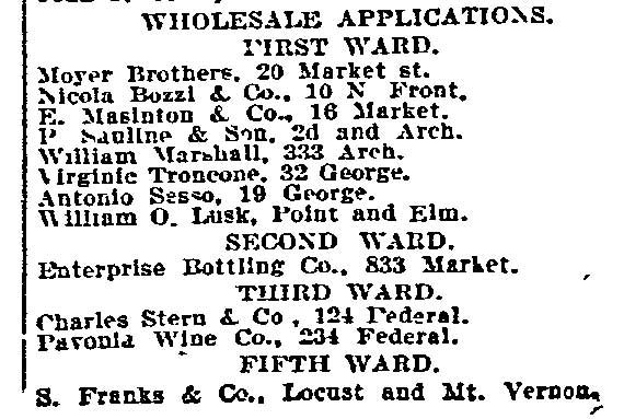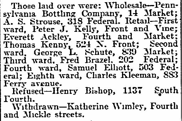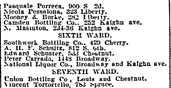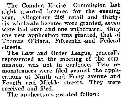 Back in a time where by reading the daily newspaper you could stay very informed about what was going on in your city or town, newspapers actually went into great detail reporting local news. A regular feature for the Philadelphia Inquirer as well as the local Camden papers was reporting on who received their annual liquor license renewals. Monthly happenings from the meetings of the Excise Commission, the city bureau that regulated liquor licenses was also reported as it occurred. Below is an article from the Philadelphia Inquirer of January 7, 1904 detailing who received retail liquor licenses, and who received wholesale licenses. The wholesale firms were for the most part bottlers and beer distributors. A few applications were tabled until the next meeting, one was refused, and one withdrawn. To download the article as a PDF file, click here. |