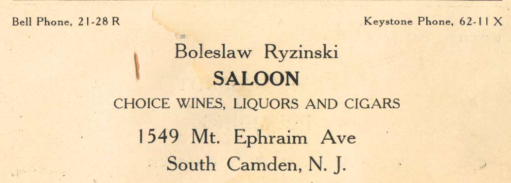 Boleslaw Ryzinski was operating a saloon and liquor store at 1549 Mount Ephraim Avenue in 1919 when Prohibition was enacted. He continued operating under a soft drink license through at least 1924. He subsequently opened a hardware store at that address. Boleslaw Ryzinski was born in Poland around 1884. He came to America in 1902 and married wife Bronislawa in 1913. There were two daughters born to them, Elizabeth and Jennie Ryzinski. His son-in-law, Second Lieutenant John Henry Moses, was killed in action over Italy on September 18, 1944, while serving with the 428th Bomber Squadron, 310th Bombardment Group, Medium. After World War II, he appears in City and telephone directories as Benjamin Ryzinski. He was still listed in the 1959 telephone directories as operating his hardware store at 1549 Mount Ephraim Avenue as late as 1959. Boleslaw Ryzinski's daughter, Elizabeth Ryzinksi Moses, taught at Camden High School for 37 years. |