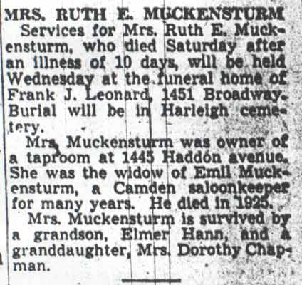 Charley's Place, at 1445 Haddon Avenue, is in a building whose history as a bar goes back before World War I. The bar was, in those days, called Emil Muckensturm's Saloon. Emil Muckensturm died in 1925. When Prohibition was repealed, the bar opened back up. The bar was operated by Emil Muckensturm's wife Ruth. Her grand-daughter Dorothy and her husband, Alfred Chapman, operated it through the late 1970s. In those times the bar was known as Chapman's Cafe. The bar has been known as Charley's Place since the 1990s. |