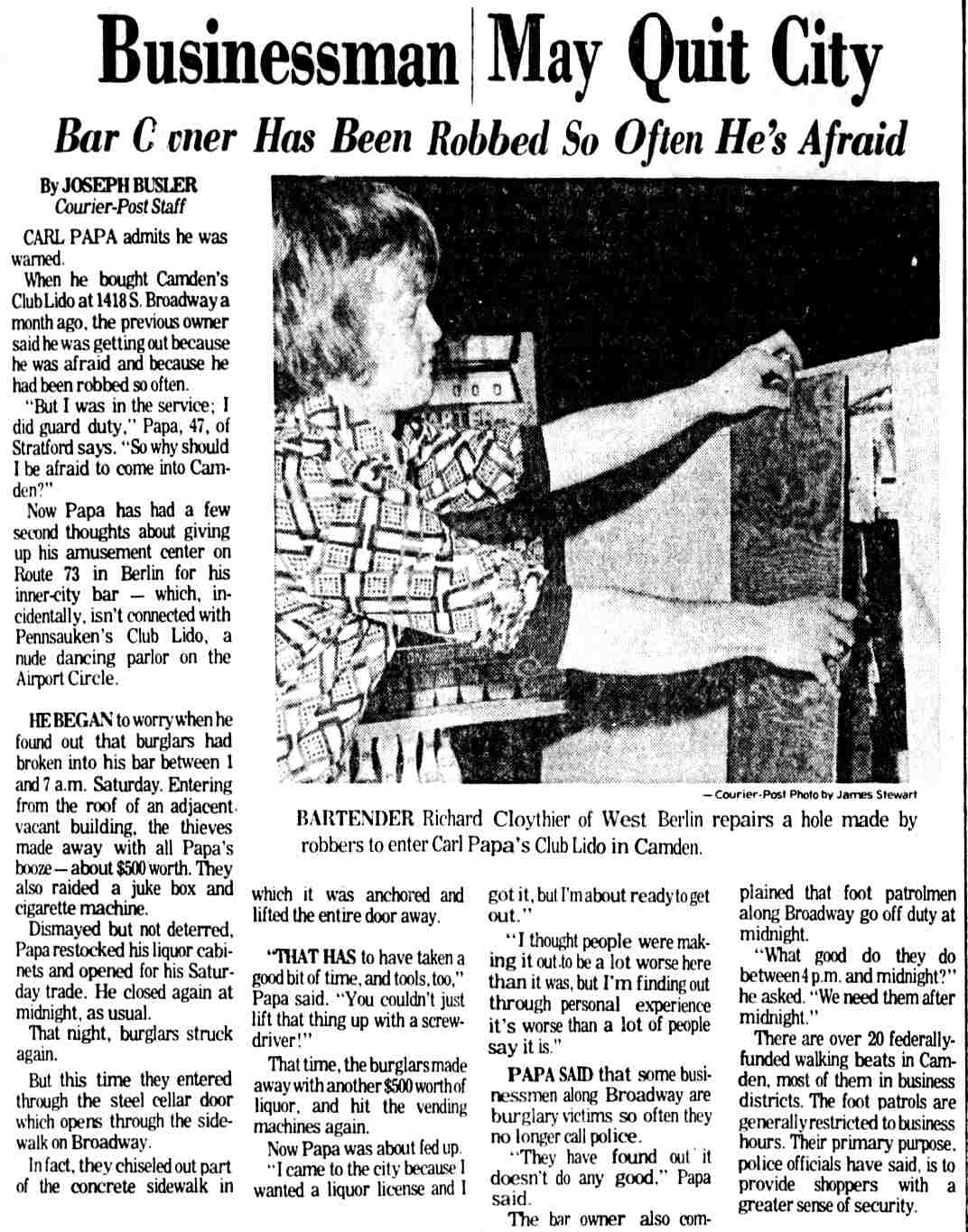 The Cafe Lido at 1418 Broadway opened up shortly after the repeal of Prohibition. A 1935 newspaper article lists the bar at Broadway and Liberty, and refer to it as the Cafe Lido. In October of 1936 Gus DeLuca became the proprietor of the establishment, and renamed it Club Lido. Directories from 1947 onward show the address at 1418 Broadway, near the corner of Broadway and Atlantic Avenue, and as Club Lido. Charles DeLuca was the licensee in early 1939. In June of that that year the license was transferred to the partnership of Charles J. Deluca and Joseph Garaguso. Morris DiAngelo was the proprietor according to the 1947 Directory, and retained the principal interest in the establishment as late as 1967. The Club Lido remained open on Broadway into the early 1970s. It was gone by 1977. Morris DiAngelo was born on January 19, 1914 in New Jersey, the second son of Amadio and Santa Angelo. The Angelo family lived at 420 Line street in Camden at the time of the 1930 census, when the elder DiAngelo was working as a laborer at the Camden Coke plant. By 1947 Morris DiAngelo was operating Club Lido, He lived at 420 Line street in Camden according to the City Directory. Morris DiAngelo also owned the Greenwood Inn in Pennsauken, and kept the Greenwood through the 1950s. The ground next door was a Mobil gas station, DiAngelo sold that pierce of property to Mobil. The brick rancher along side the parking lot was where he lived. Morris DiAngelo passed away September 28, 1997. Carl Papa bought the bar in January of 1975. By mid-February he was considering closing up after having been burglarized twice. Club Lido is not listed in the 1977 New Jersey Bell Telephone Directory. |