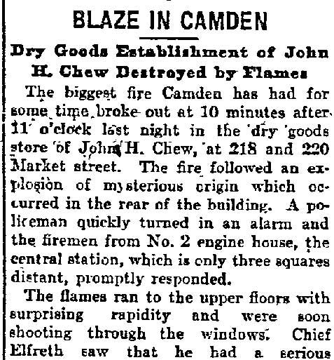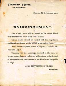The Columbia Hotel operated at the turn of the century at 224 Market Street. August Hettmannsperger had opened up his lager beer saloon by 1887, according to the city directory of that year. By the turn of the century his establishment had bloomed into a full scale hotel, serving meals. August Hettmansperger was running the Columbia Hotel as late as 1904, according to City Directories. The Hettmannsperger family was involved in several business in Camden in the 1880s and 1890s. Most notable was Frederick Hettmansperger, who was a telegraph instrument maker, residing at 810 Market Street. By 1905 the Hettmanspergers were gone. Thomas Wilson is shown operating the business in 1905. John P. "Jack" Scannell had the bar in 1906 through 1909, and for much of this time W. Harry Smith tended bar there. Walter J. Ott traded there from 1910 through at least 1913. The bar was run by John Reilly in the years 1915 through 1924 according to Camden City Directories. From 1924 through 1932, the bar operated as the Victor Hotel, under the proprietorship of William J. Sheehan. who ran it under a "soft drink" license, i.e., he sold low alcohol content near beer. In June of 1932 Sheehan was fined and sentenced to three months in jail for operating a speakeasy. Six half-barrels of beer and 11 gallons of hard liquor had been found in a raid the previous April. When Prohibition was repealed in 1933, a liquor license was obtained for the premises, and by 1936 the bar was known as the Hi Hattter's Club. Owners Tom Mayer and Herb Marker actively promoted their establishment. They employed John "Jack" Miko as a bartender, who was quite popular. The bar is listed as the Hi Hattter's Club in the 1940 and 1943 Camden City Directories. There is no listing in the 1947 Camden City Directory, but 224 Market Street appears in the 1956 New Jersey Bell Telephone Directory as the High Hat Club. By 1959 the bar had changed hands and changed names, and was known as the bell bar. the Bell Bar remained open through at least 1984. The 200 block of Market Street was razed and redeveloped in the late 1980s or early 1990s. |