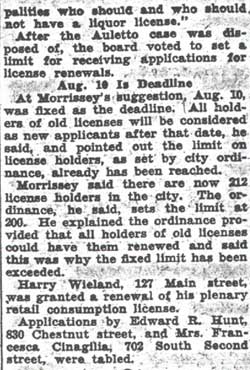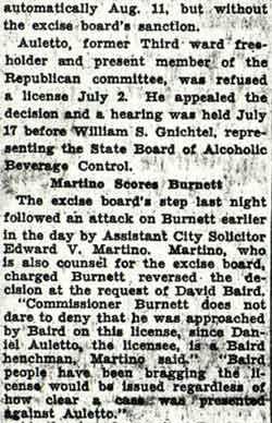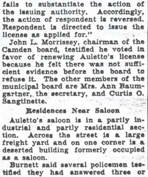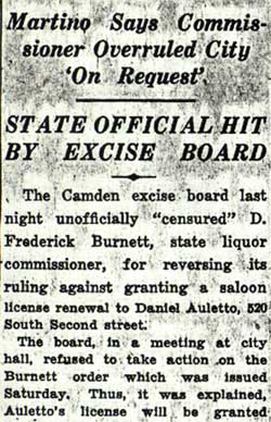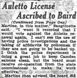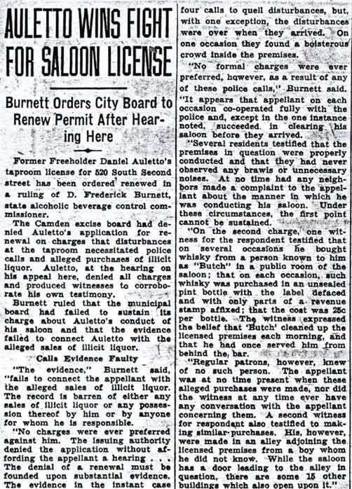 Daniel Auletto served as a Republican Freeholder from Camden in the early 1930s. He was a political ally of David Baird Jr. He had been born in Pennsylvania in 1897, and was a veteran of World War I. By 1930 he had married, and was living with wife Anna and sons Joseph, Daniel, and Louis at 205 Royden Street at the time of the 1930 Census. he was then operating a retail candy store. Daniel Auletto operated a taproom on South 2nd Street in the mid 1930s. When political power shifted to the Democrat Party in Camden in the mid-1930s, his political fortunes changed, and with that came problems in getting his liquor license renewed. The bar does not appear in the 1940 Camden City Directory. By 1947 the bar was definitely gone, as the premises were occupied by Latham Ballance, who operated a restaurant, the Ballance Lunch Room, at that address. Daniel Auletto and his wife were still living at 205 Royden Street in that year. |