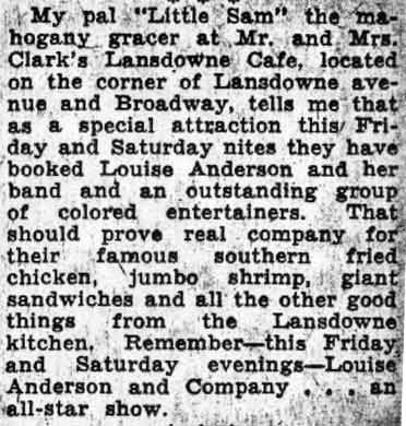 1447 Broadway was not a bar prior to Prohibition. The building was a private residence at the time of the 1920 Census. A saloon did exist on the opposite corner, at 1451 Broadway, run by Stephen Stefaniak. This bare was in existence as late as 1921. At some point that building was acquired by Frank Leonard, and the building was converted into a funeral home. By 1930 Stephen Stefaniak had moved to Runnemede NJ, where he operated a grocery store. 1447 Broadway is listed in the 1931 Camden City Directory as a cafe with Jacob Toner as the proprietor. By 1938 Thomas A. Clark owned the bar, which was known as the Lansdowne Cafe. He operated the bar, which featured food and live entertainment. The Lansdowne was well known for crabs for many years. When Mr. Clark died, his wife took over management of the bar. Around 1959-1960 Joe Greco bought the Lansdowne Cafe and ran it into the mid 1960s. The Lansdowne Cafe was renamed in the mid-1970s, and was known as the Jewel Box Cafe, and later as the New Jewel Box Cafe. In 1984 Mel Jones bought the property, and ran it as the Debonair Lounge until 1988. 1447 Broadway is no longer standing. I believe it was razed in the early 1990s. |