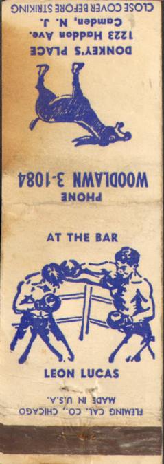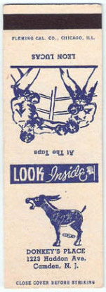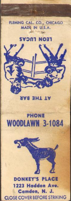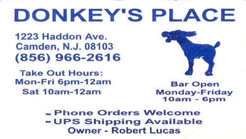 evidence today. Leon Lucas renamed the establishment Donkey's Place, and the bar soon gained a reputation for it's delicious steak sandwiches, served with fried onions on a poppy seed roll. The bar remains in the hands of the Lucas family, with son Bob Lucas operating the business since his father's passing in 1971. Donkey's place remain open in as of the fall of 2005, known far and wide for delicious food and drink. In 2003 Bob Lucas opened a second location in Medford NJ, and in 2005, a third Donkey's Place opened up, at 1018 Asbury Avenue in Ocean City NJ. |