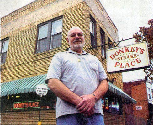 landmark does one thing - and does it right by Donkey's Place, a bar and cheesesteak landmark on Haddon Avenue, is alive and well after 61 years of operation by the Lucas family. Located on the corner of Haddon Avenue and Liberty Street, the weathered, tan brick building with a green wraparound awning catches the eye because its front door is angled in a way that is unique to commercial corners in northeast cities. Inside, Bob Lucas, 64, wipes the bar, greets old friends and makes new customers feel welcome. His low-key presence is a safe harbor in an oft-troubled neighborhood. "There's no pool table, no dartboard or jukebox in here because my customers eat and leave," Lucas said. "Never any drunks or underage kids because they know it's just not the place." A heavy smoker, Lucas doesn't worry about the possible impact of pending no-smoking legislation on his business. "My customers don't stay much more than 20 to 30 minutes," he said. "Anybody - even me - can last that long without a cigarette." Lucas grew up in an apartment over the bar in the days when it was open six days a week until 2 a.m. Today, it's open Monday through Friday until 6 p.m. Lucas lives in Medford, where his children are running a Donkey's Too on Tomlinson Mill Road. "My dad was a boxer and his nickname was Donkey, because he was told he had a punch like a mule," said Lucas about the bar's name. The walls are covered with photos of Leon Lucas, a light heavyweight who went to the 1928 Olympics in Amsterdam along with Jim Thorpe. His boxing gloves are behind glass in the bar, next to a piano, that is next to a broken neon sign and a pile of clutter. Downstairs is a former speakeasy with a secret door that was a hot spot during Prohibition under a previous owner. "This bar hasn't changed a bit and I've been coming here for almost 50 years," said Ivan Cantiant, 67, while sipping a Coors Light at the 12-stool bar. "The neighborhood has changed, but I come for the food and because it's a cheerful place," said Cantiant, a retired tractor-trailer driver from Stratford. The menu is limited to cheesesteaks sandwiches with or without cheese, with or without onions; french fries or potato chips are on the side. Round sesame rolls from DelBuono's in Haddon Heights are steamed closed before delivery on a paper plate. No soup, no chicken, no tofu. Not even a Tastykake. Just 400 steak sandwiches on a good afternoon. The Donkey steak is so beloved that Lucas fills orders from homesick people, sending partially cooked sandwiches via UPS as far away as Hawaii. "It's a nostalgic place that has a very loyal following," says Randy Primas, chief operating officer for the city of Camden and former two-term mayor. "I was raised on those sandwiches. Recently, Sen. (Wayne) Bryant and I stopped for lunch, and we bumped into a couple of Camden judges." An East Camden native, Primas also is nostalgic for the days when Haddon and Kaighn avenues were safe and prosperous shopping streets. "Despite that statistic that called Camden the most unsafe city in America, I don't feel it," Primas said. "It is our hope that places like Donkey's will last until there are no longer any issues about safety on Haddon Avenue." Lucas says he has no plans to retire or sell the business. He remains one of about 90 barkeepers in a city that 40 years ago had 200 bars. "We're doing well. We really are," Lucas said. . |