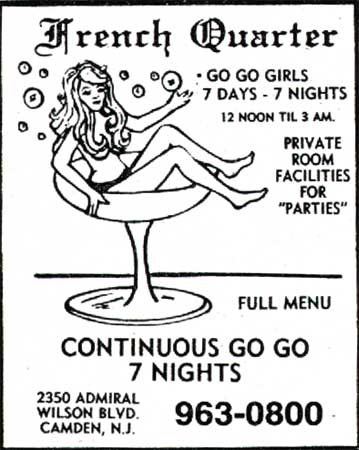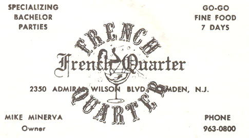 The French Quarter appears to have been built on the Admiral Wilson Boulevard in the early 1960s. It was originally called the Holiday Tavern & Lounge, and appears as such in new jersey bell Telephone Directories as late as 1964. By 1966 the bar had been renamed The French Quarter, in all probability an attempt to cash in on the name of the very popular Latin Casino, which was a few minutes away on Route 70 in Cherry Hill NJ. NACE Inc. was the management entity of the bar as early as 1966. By the 1970s the nightclub business all over South Jersey began to suffer. The Latin Casino eventually closed, as did many other venues that featured live music. The French Quarter, along with the Admiral Lounge and the Oasis Lounge (later known as the Harem Lounge) all became go-go bars. By the mid 1970s another go-go bar, Minnie's Lounge, opened up on the westbound side of Admiral Wilson Boulevard. Of the four bars, Minnie's was probably the most famous, as "Miss Vicki", the ex-wife of entertainer Tiny Tim, danced there for a few years. With the addition of an x-rated bookstore that featured "live, nude girls" in Pennsauken, the Admiral Wilson Boulevard had a very bad reputation by the early 1980s. There was a limited amount of prostitution in and near the three motels on the westbound side, the Four Winds, the Oasis, and the Wilson Motel. The French Quarter, however, was referred to as the Sunday School of the strip because the owner, Mike Minerva, kept a 'clean' business. The French Quarter was briefly closed in 1993 when its parent corporation NACE Inc. was cited for non-payment of New Jersey State Sales Tax. The buildings were later sold to a church, which operated there for a few years. In 1999 then New Jersey Governor Christine Todd Whitman seized every on the east- bound side of Admiral Wilson Boulevard under the excuse of "cleaning up" the Boulevard. It was a very strange cleanup, as no work at all was done on the west-bound side. In any event, the French Quarter, the Admiral, and the Harem Lounge were leveled, along with many other commercial properties, which only has served to deepen the financial problems of the City of Camden, which could ill-afford to lose tax-paying commercial properties. |