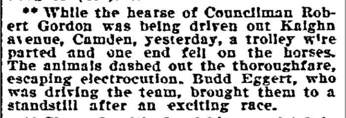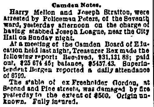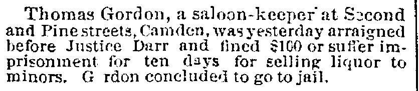 Thomas Gordon and his wife Maria had a saloon and stable at 801 South 2nd by 1876. They ran the businesses into the 1890s, then operations fell to their sons Thomas and Robert. Robert Gordon didn't initially go into the business, the 1887 through 1890-1891 city directories show him working as a printer/compositor. The elder Gordons both died in early 1895. Robert Gordon married Emma Compton, of whom more will wrote of below. Robert and Thomas Gordon was involved, the City Directory entry for that year reads "Gordon Thomas, Stable & Liquors 801 and 807 South 2nd street", with Robert Gordon's entry reading "Gordon, Robert W., manager, home 807 South 2nd street". Robert Gordon was politically active and was elected as a Republican to Camden City Council from the Fifth Ward in 1904. The 1910 Census sheet, dated April 18, 1910 discloses the following for 801-807 South 2nd Street. Robert W. Gordon, age 45; born in Ireland; occupation: proprietor livery stable (head of household); Emma Gordon, age 37; born in New Jersey; occupation: none (wife); Thomas Gordon, age 49; born in Ireland; occupation: proprietor saloon (brother). Thomas W. Gordon died at the age of 51 on April 26, 1912. The 1914 City Directory shows Robert W. Gordon - livery and liquors at 801 South 2nd Street, with his home at 807 South 2nd Street. Robert Gordon died on December 19, 1914. Mrs. Emma Gordon ran the bar through 1919, until age, changes in the neighborhood, and the onset of prohibition gave her cause to move away and lease the business. This did not turn out to be a very good idea. The 1924 Camden City Directory shows that Joseph Devine was operating under a "soft drinks" license, which meant he could sell low alcohol beer. Joseph Devine's real name was Joseph Deven. He was better known as Polack Joe Devon (newspaper accounts spell his name in various ways, Deven, Devon, Devine, etc.) and was a somewhat notorious character as a political leader and gangster in Camden's Third Ward. Emma Gordon had moved back to 807 South 2nd Street by 1924, and lived there a late as 1927. By 1929 Jerome A. Mauro had both the home at 807 South 2nd and the bar at 801, which, as Prohibition was still in force, he operated under a soft rink license. Robert & Emma Gordon's great-great-neice Beth Crane wrote in 2008: Emma and Robert Gordon were my great-great-aunt and uncle and I grew up (in the 1950's) hearing stories about this saloon. According to which family member you were listening to, it was either a magnificent Taj-Mahal-palace of a saloon, where all the best people in Camden hobnobbed … or it was a filthy hellhole where all the lowlife hoodlums congregated, and Satan was the bartender. I've always wondered what was the truth about the place. Robert Gordon was a Camden city councilman, so the saloon was first in his brother's name (Thomas Gordon) then in Emma (Compton) Gordon's name. I guess he didn't want the teetotalers in town voting against him! Here is an interesting story about Emma Compton that I think should be preserved for posterity: Emma lent money to Rev. Carl McIntyre for him to build that church of his in Collingswood, so she held the mortgage on the church. When she died, Rev. McIntyre was horrified to learn she had left the mortgage to her nephew, Ed Compton, who owned Compton's Log Cabin, a seafood restaurant on Cuthbert Boulevard where "demon rum" was served. He was so afraid that it would become public knowledge that his church's mortgage was held by the owner of an alcohol-serving establishment that he immediately showed up at Ed's with the CASH to pay off the mortgage in full. I heard their livery stable specialized in providing fancy horses (I'm not sure that is the correct way to put it) for funeral corteges. What I mean is, the horses would be wearing elaborate silver and black harnesses with long black feathers sticking straight up from their foreheads. My grandmother told me that when my grandfather was just a little boy (he was born in 1897), Emma would save the corks from the champagne bottles from the saloon for him to play with. And if the saloon served champagne … well, it couldn't have been such a den of iniquity. The truth of the matter of palace of hell hole lies somewhere in between. When the Gordon's were operating the business, and as Robert Gordon was active politically, serving as a city councilman, the Gordon's establishment would have been a top of the line, for those times and in that neighborhood, establishment. South 2nd Street was a much more traveled road in those times. It connected the Market Street Ferry and the Kaighn Avenue Ferry, and from South Second and Kaighn Avenue one would pick up Ferry Avenue to travel southwards to Gloucester, Woodbury, and the rest of South Jersey. For all intents and purposes, every traveler who came to South Jersey over the Market Street Ferry to go southwards into New Jersey and who did not continue by rail would pass by the Gordon's business. THEN things changed. The introduction of the automobile and improvements to Broadway didn't help business, Thomas Gordon died in 1912 and Robert Gordon passed away in December of 1914.When Prohibition came on in 1919 and with Robert gone, the bar apparently was rented. There were A LOT of shady characters in that part of South Camden, and Polack Joe Deven (or Devon, or Devine) was one. Polack Joe was politically active in the 1920s when oftentimes you couldn't tell the gangsters from the politicians. There is no doubt that when he was running the bar, Camden's more notorious characters would have been his clientele. The 1947 Camden City Directory shows that the house at 807 South 2nd Street was still occupied, but no mention is mad of 801 South 2nd. It is likely that the building may have not still been standing at that point in time. |