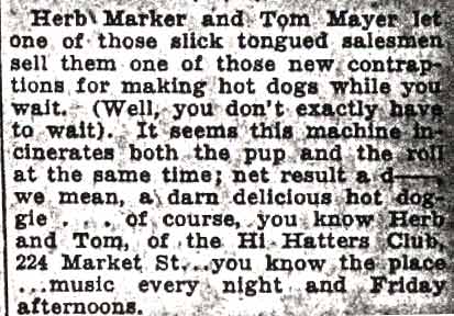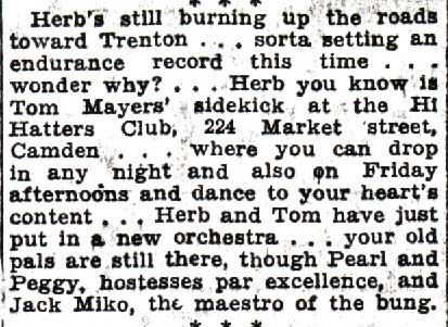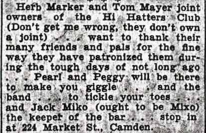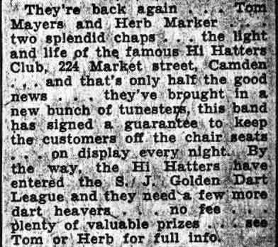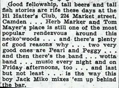 This bar's history in Camden covered almost 100 years, beginning in the mid 1880s. August Hettmannsperger appears in the Camden City Directories in the years covering 1887 through 1891 as the proprietor. He called his establishment the Columbia Hotel. Hettmansperger had come to Camden from Baden, Germany in the 1870s, and appears in the 1880 Census, when he was working as a locksmith and living with wife Mary and children Emma and August Jr. at 18 South 4th Street. The Columbia Hotel was still run by August Hettmansperger as late as 1903. By 1905 the Hettmanspergers were gone. Thomas Wilson is shown operating the business in 1905. John P. "Jack" Scannell had the bar in 1906 through 1909. Walter J. Ott tradd there from 1910 through at least 1913. The bar was run by John Reilly in the years 1915 through 1924 according to Camden City Directories. From 1924 through 1932, the bar operated as the Victor Hotel, under the proprietorship of William J. Sheehan. who ran it under a "soft drink" license, i.e., he sold low alcohol content near beer. In June of 1932 Sheehan was fined and sentenced to three months in jail for operating a speakeasy. Six half-barrels of beer and 11 gallons of hard liquor had been found in a raid the previous April. When Prohibition was repealed in 1933, a liquor license was obtained for the premises, and by 1936 the bar was known as the Hi Hatter's Club. Owners Tom Mayer and Herb Marker actively promoted their establishment. They employed John "Jack" Miko as a bartender, who was quite popular. Herbert Marker was born December 2, 1902 in New York to immigrant parents Max and Mollie Marker, who had come to Camden by the mid-1920s. Max Marker was cigar maker, and by 1930 owned a home at 400 Penn Street. He later opened up a store at that location. At the time of the 1930 census Herb Marker was working as a waiter in a restaurant. He later moved to Buffalo NY where he passed away in March of 1974. Of Tom Mayer little is known as of this writing. Jack Miko remained a Camden resident until his death in August of 1988, four days after his 80th birthday. The bar is listed as the Hi Hatter's Club in the 1940 and 1943 Camden City Directories. There is no listing in the 1947 Camden City Directory, but 224 Market Street appears in the 1956 New Jersey Bell Telephone Directory as the High Hat Club. By 1959 the bar had changed hands and changed names, and was known as the Bell Bar. The Bell Bar remained open through at least 1984. The 200 block of Market Street was razed and redeveloped in the late 1980s or early 1990s. |
