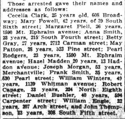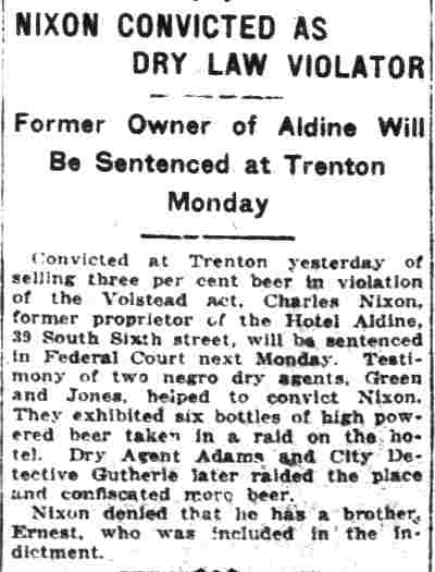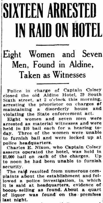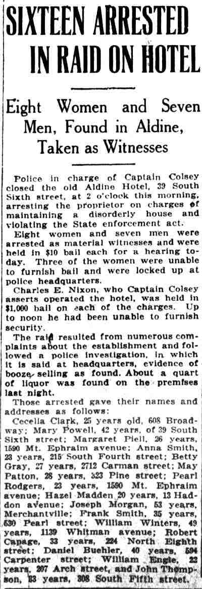 into 1895. By 1910 the business was known as the Hotel Dubosq. J. Carrow DuBosq was then raising his children, Thaddeus and Regina DuBosq alone, with his older sister Mary Frances living with the family as well. J. Carrow DuBosq remained in business under that name through at least 1914. By 1916 he had renamed the business Hotel Aldine and was still running the business as late as the fall of 1918. By the time of the 1920 City Directory was compiled, J. Carrow Dubosq had leased his business to Agnes Wurst. He was still living on premises, with 595 Bridge Avenue given his street address in the 1920 Census. By September of 1921 the Hotel Aldine was being run by Charles Nixon, who had previously kept a saloon at 1700 Federal Street, and who had been arrested in July of 1920 and August of 1921 for Prohibition violations. . The Hotel Aldine was still in operation as late May of 1924. It had been raided in March if 1924, and was raided again in May. Charles Nixon was running a speakeasy and disorderly house, i.e., a brothel, out of the premises. By November the business had closed and the property put up for public sale. Nixon was sentenced in 1925 to a short prison sentence for selling alcoholic beverages. Frank Hineline of the Camden Lime Company bought the building and after remodeling the interior moved its offices into 39 South 6th Street in April of 1925. Camden Lime was still headquartered there as late as 1940. By November of 1941 Camden Lime had moved to 1433 Pine Street. The 1947 Camden City Directory states that 39 South 6th Street was then the address of the American Red Cross production department. |