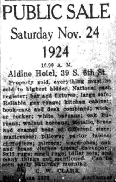 The Hotel Aldine at 39 South 6th Street operated in a building that had been built in 1889 as The New Junction Hotel by Mrs. Katherine "Katie" Zimmerman. Her late husband, William G. Zimmerman, had operated a business called the Junction Hotel nearby on Haddon Avenue south of Carman Street, opposite the Haddon Avenue rail station as far back as 1877. William G. Zimmerman died on February 29, 1888. Mrs.