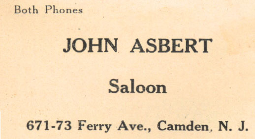 This bar appears in the 1887-1888 and 1888-1889 Camden City Directories as being operated by a Charles Kelly. Daniel Kelly ran the bar as late as 1914. John Asbert was the proprietor by 1918. John Asbert was a Polish immigrant. He was born in what was then Prussia in 1871, and came to America in 1887, and married his wife Martha in 1893. When Prohibition went into effect in 1919, Asbert's saloon-keeping was curtailed, although he continued operations under a soft drink license through at least 1924. By 1930 he had moved to Gloucester City NJ. Felix C. Knast and his wife Mary had operated the bar from the 1930s through the early 1950s at 671-673 Ferry Avenue. The bar was then known as the Knast Cafe. On June 2, 1939 the bar was held up "around closing time, by two Negro men wearing masks, one with a gun". This block of Ferry Avenue was taken in the early 1950s by the City of Camden to make room for the Franklin D. Roosevelt Manor public housing project, Interstate 676 and other projects that did not come to fruition in later years. Like several other of the business owners who were displaced, the Knasts relocated their business nearby. The new Knast cafe was built at 1703 Mulford Street, on the corner of Van Hook and Mulford Street. The Knast family operated the new bar bar through the early 1970s. By 1974 they had sold the business and Felix and Mary Knast had moved to Glendora NJ. Felix Knast passed away in December of 1981 at the age of 79, survived by his wife, who died in August of 1989. |