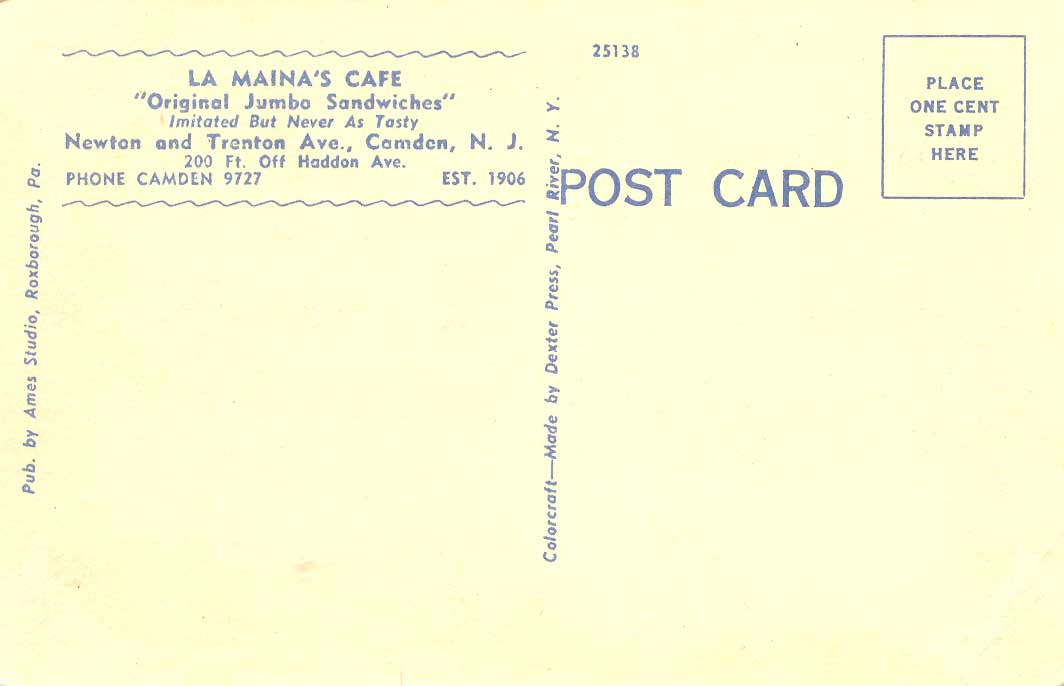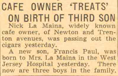 The LaMaina family's bar on Newton Avenue at Trenton Avenue was established in 1906. The bar, which was operated in 1931 by Nicholas LaMaina, also served sandwiches, and was a well known spot in Camden. The family also operated bars at other locations in Camden. Theresa LaMaina is recorded as operating a bar at 824 South 3rd Street, the corner of 3rd and Pine Streets, in 1831, and the same bar is noted as being run by Mrs. Anna LaMaina in 1947. During prohibition, Lawrence LaMaina, who was living with wife and son Nicholas, went into the real estate business. Nicholas was working in a shoe store at the time of the 1930 census. When Prohibition was repealed in 1933,Nick LaMaina procured a liquor license, and opened up the cafe. Like the Deighans, Cinellis, Capriottis, and other families who had been in the bar business in Camden, the LaMainas headed for the suburbs after World War II. By the mid 1950s they had relocated to Marlton Pike and Sayer Avenue in Delaware Township (present-day Cherry Hill) NJ. 501 Trenton Avenue was known as Stanley's Tavern in the mid 1950s, and Petro's Cafe by 1959. During the mid-1960s and early 1970 it was called Syl's Tavern. After standing vacant through most of the 1980s and 1990s, the bar that had been LaMaina's Cafe was demolished. Nicholas LaMaina passed in June of 1985, survived by his wife Florence, who joined him April 23, 1991. One of his sons, Dr. Nicholas F. La Maina, became a well known podiatrist. He passed away in Florida at the end of 2008. |