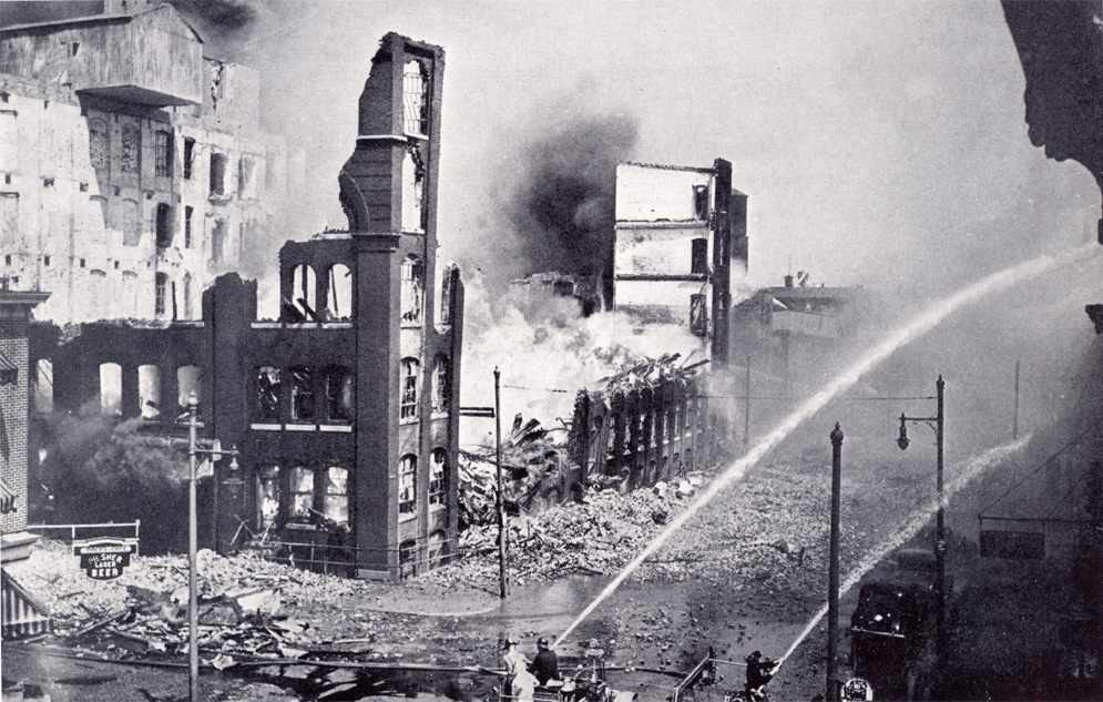 Below, firemen are protecting exposures against the intense heat from the ruins of No.6 Building. MacDougall's Tavern aka Mac's Bar is visible at the lower left. |