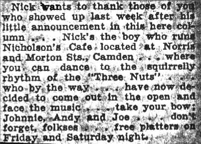 The bar at Morton and Norris Street was open by the fall of 1936, when it was known as Nicholson's Cafe. As Nicholson's Cafe, the bar featured music, food, dancing, and live music. One of the acts that appeared at the bar was a trio known as The Three Nuts, who appeared at other bars in Camden and the surrounding vicinity. The bar changed hands shortly thereafter, as by 1939 Frank Mroczkowski and William Zawojski are recorded as operating the premises as the Morton Cafe. The 1940 Camden City Directory records only frank mroczkowski as the proprietor of the Morton Cafe. William Zawojoski had moved to 1900 Fillmore Street where he operated a bar during the 1940s. William Zawojski later moved to Pleasantville NJ and passed away in 1975. frank mroczkowski and the Morton Cafe were listed in the 1947 Camden City Directory, and he was listed at 1299 Morton Street in the New Jersey Bell Telephone directories as late as 1970. frank mroczkowski passed away in June of 1972 at the age of 69. The bar changed hands during the 1970s, and was listed in the telephone directories as late as 1977 as Buck's Lounge. By 1990 there was no bar operating at this location, and as of 2003 the building was being used as a church. |