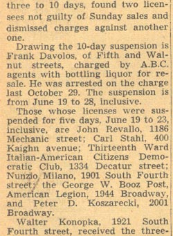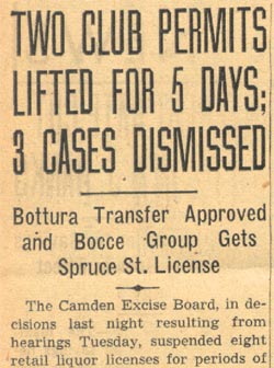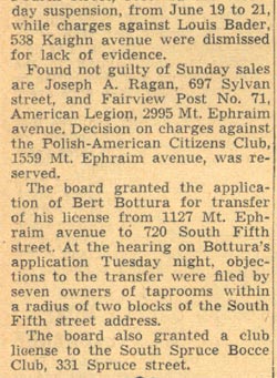 The Pine Grill & Bar was run from June of 1939 through at least 1943 by Bert Bottura. He previously had bars at 600 South 3rd Street and at 1127 Mount Ephraim Avenue. Granted a license over the objection of nearby bar-owners who did not want competition, and certain neighbors, the Pine Grill flourished nevertheless. By 1947 Sabatino Frattaroli was the proprietor. By the 1950s he had moved to East Camden, and remained there until his passing in 1979. It is unclear as of this writing how long he was connected with the Pine Grill & Bar. The Pine Grill was well known for its Italian food, and was still serving fine food in South Camden as late as 1988. Pasquale "Pat" Massi ran the Pine Grill & Bar in the 1980s. In the mid 1990s the Pine Grill was one of a number of buildings in the immediate neighborhood that were completely renovated and converted into apartments. This is the purpose which this building serves as of October 2003. |