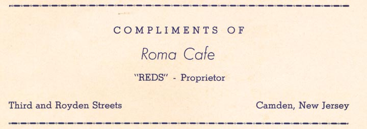 When the 1931 Camden City Directory was published, Joseph Griffo was operating a cafe at 600 South 3rd Street. Bert Bottura was running the bar in the mid 1930s; he would go on to operate the Pine Grill at 720 South 5th Street in the early 1940s. By 1939 Antonio Cerasaro had acquired the property, and was running the bar, which was by the known as the Roma Cafe. The 1947 Camden City Directory shows that Antonio Cerasaro was still the proprietor, living on premises with his wife Angeline, and that Americo Cerasaro lived and worked their as a bartender. The Roma Cafe appears in the 1964 New Jersey Bell Telephone Directory, and was still open as late as 1965, but is not listed in the 1966 edition. After a police raid in the mid-1960s, the phones were removed. Americo Cerasaro applied for a renewal of the liquor license in June of 1967, so the bar appears to have remained open. By 1970 Americo Cerasaro, better known as Reds, Had closed the bar, and gone in partnership with John Meloni in a bar called RJ Lounge at 524 West Street, which had previously housed a social club, the Union of Brotherly Love Camp Walt Whitman No. 1. Americo Cerasaro passed away in August of 1974 at the age of 50. The Roma Cafe stands boarded up and vacant in November of 2003. |