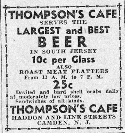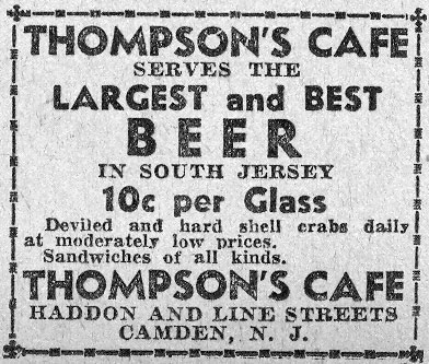 571 Haddon Avenue was a bar for many years before being razed in the late 1960s. William F. "Billy" Sand owned the business as early as 1906 until May of 1914, when he sold the business to James D. Thompson. Under the name Thompson's Cafe, the bar was still running under James D. Thompson's management as late as August of 1933. By 1936 William Dischert had acquired the business, and he was still there as late as 1951. From 1951 into 1955 the bar was known as Stewart's Toby Tavern. By the spring of 1957 the bar was called The Corner, and it retained that name through at least 1969. 571 Haddon Avenue and all but a few of the buildings on the 500 block of Haddon Avenue were razed shortly afterwards to make way for Interstate Highway 676. |