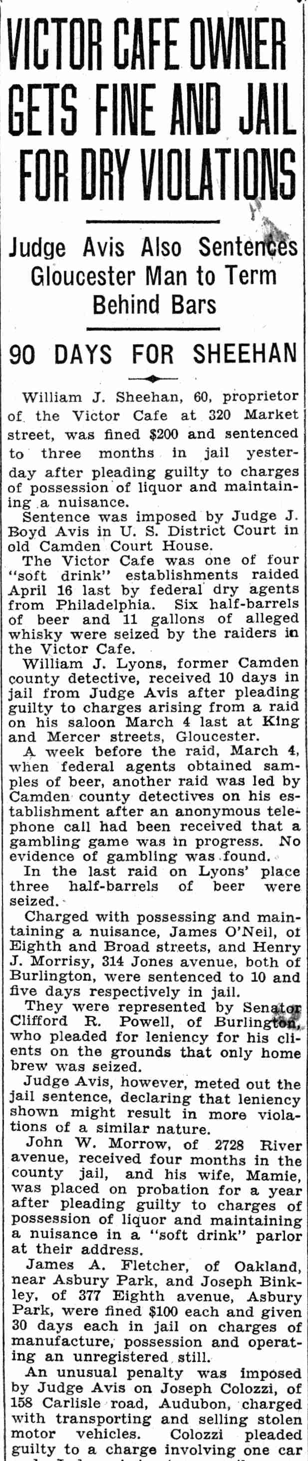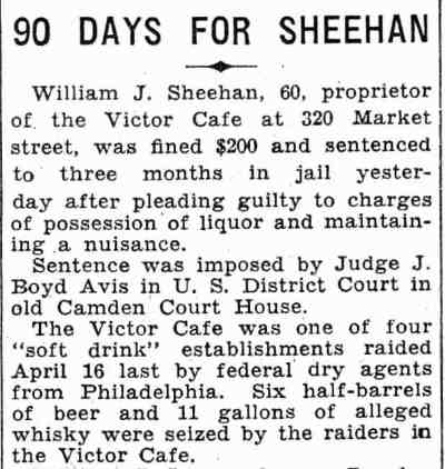 This bar's history in Camden covered almost 100 years, beginning in the mid 1880s. August Hettmannsperger appears in the Camden City Directories in the years covering 1887 through 1891 as the proprietor. He called his establishment the Columbia Hotel. Hettmansperger had come to Camden from Baden, Germany in the 1870s, and appears in the 1880 Census, when he was working as a locksmith and living with wife Mary and children Emma and August Jr. at 18 South 4th Street. The Columbia Hotel was still run by August Hettmansperger as late as 1903. By 1905 the Hettmanspergers were gone. Thomas Wilson is shown operating the business in 1905. John P. "Jack" Scannell had the bar in 1906 through 1909. Walter J. Ott traded there from 1910 through at least 1913. The bar was run by John Reilly in the years 1915 through 1924 according to Camden City Directories. From 1924 through 1932, the bar operated as the Victor Hotel, under the proprietorship of William J. Sheehan. who ran it under a "soft drink" license, i.e., he sold low alcohol content near beer. In June of 1932 Sheehan was fined and sentenced to three months in jail for operating a speakeasy. Six half-barrels of beer and 11 gallons of hard liquor had been found in a raid the previous April. When Prohibition was repealed in 1933, a liquor license was obtained for the premises, and by 1936 the bar was known as the Hi Hatter's Club. |