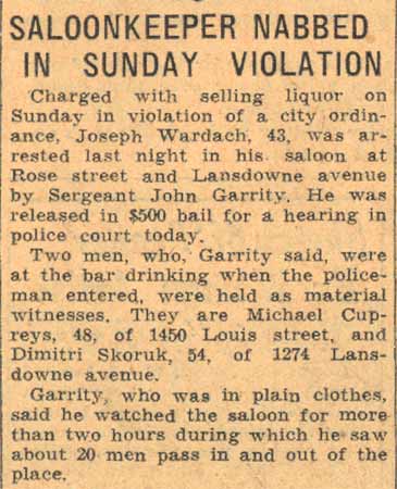Wardach's Tavern, also known as Wardach's Cafe, operated for may years on Rose Street in the Whitman Park section of Camden NJ. Opened shortly after the 1934 repeal of Prohibition by Polish immigrant Joseph Wardach, the bar was operated from the late 1950s through the late 1970s by Hank Wardach. While the Camden City Directory for 1947 lists the tavern at 1460 Rose Street (the corner of Rose and Whitman Streets), the bar actually waslocated at 1448 Rose street, the corner of Rose and Lansdowne Avenue. Joseph Wardach was born in Poland on March 18, 1892. He had married his wife Blanche prior to 1920. When he retired, his son, Hank Wardach, took over the bar. Joseph Wardach passed away in June of 1978. Hank Wardach resided at the bar's address through at least 1977. He later moved to Bellmawr NJ. He passed away May 30, 1996 at the age of 62. |