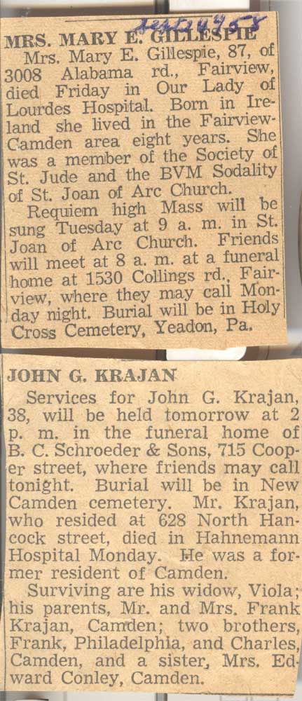 The pictures below were found among the papers of Edward Patterson, an Army veteran who died alone a few years ago in Cherry Hill, New Jersey. His mother was a Conley, and most of the pictures below appear to have been of her, her parents, and various Conley cousins. Almost all of the pictures below lacked names on the back, however, and I am hoping that some people may be able to step forward and identify the people pictured below. The photos for the most part were taken between the late 1890s and 1960. A few are from from more recent times, perhaps around 1980 or so. The photos are oversized to facilitate identification, and this page might load slowly if you have a slow internet connection. The Conley family was in Camden by the late 1890s, and they were among the first families to move to the new homes in Yorkship Village when it was built during World War I. They remained a presence their for many years thereafter. The Conleys have served Camden as members of the police department and in other aspects of civic life in the city. PLEASE contact me if you can identify anyone in any of the photographs below. I will be posting some further information about the Conley family in Camden over the next few weeks, Phil