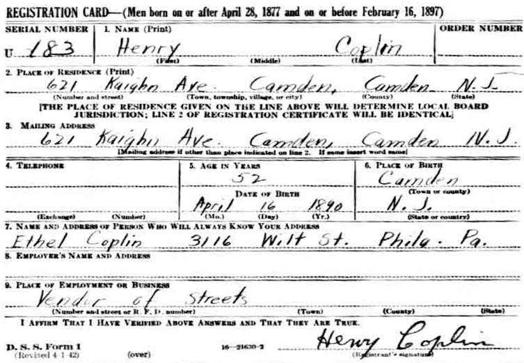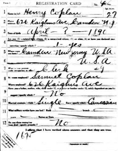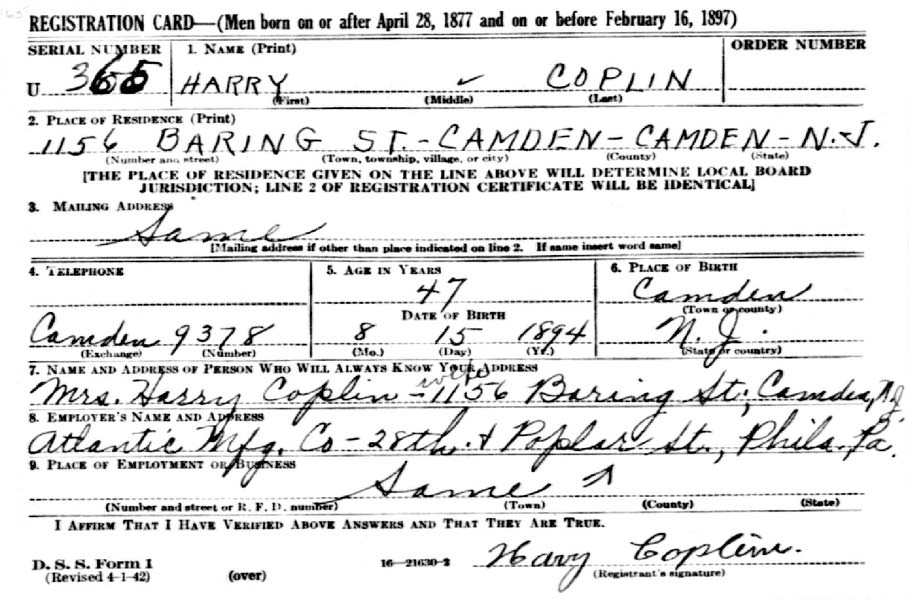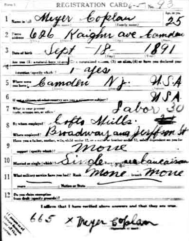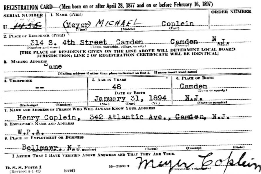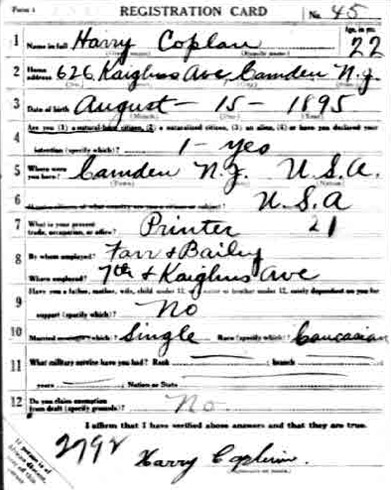 When America entered World War I, the three Coplein sons all registered for the draft. When they registered, on June 5, 1917, Henry was still working in the family store, and Meyer was still at Howland Croft. Younger brother Harry worked as a printer at the Farr & Bailey oilcloth works. |