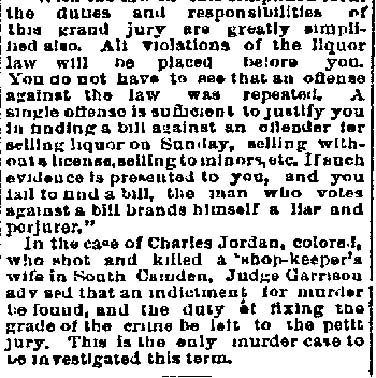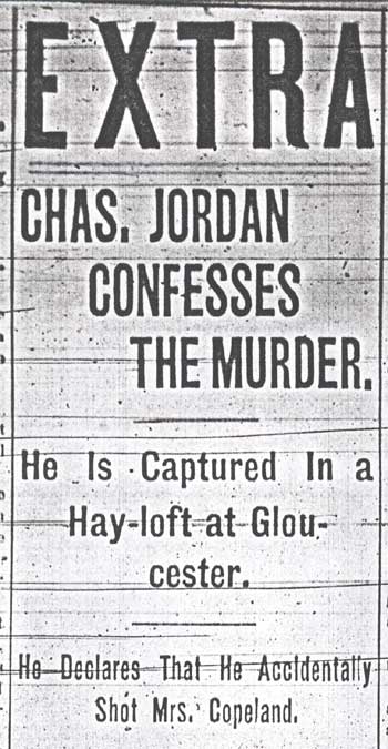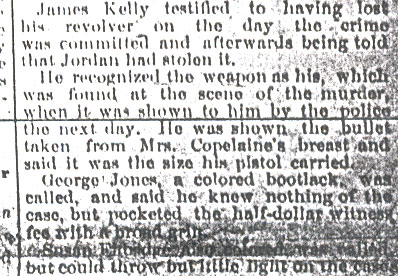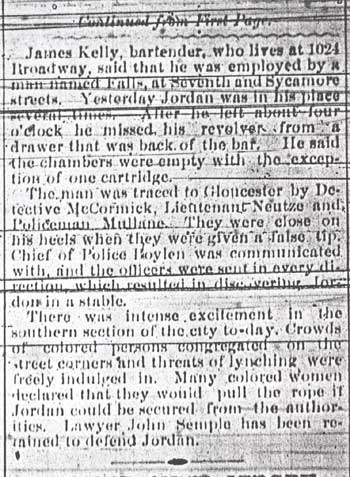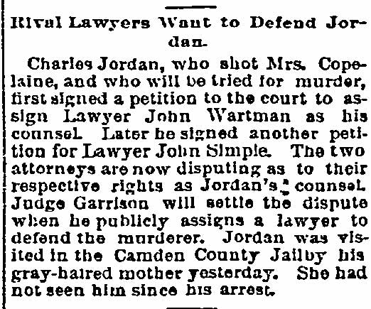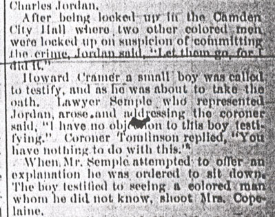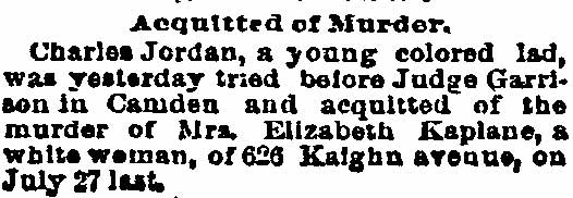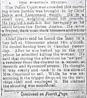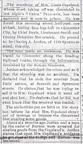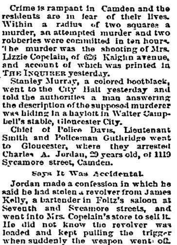 Another Murder Charles Jordan, colored, entered the store of Mrs. Sara Coplein, 626 Kaighn avenue, last Thursday afternoon, and in a few minutes the report of a pistol was heard and the man was seen to come out of the store and run down the street. Those who heard the report went into the store immediately and found Mrs. Coplein lying dead on the floor with a bullet hole in her left breast, death having been instantaneous, and the postmortem examination showed that the ball had penetrated the lung, severed the pulmonary artery and lodged in the back bone. Jordan for a time made good his escape, as the whole thing was done so quickly that no one thought of stopping him until it was too late. He was eventually captured in a barn in Gloucester City, by Chief of Police Davis and his assistants through information received from another colored man, and brought to this city before Police Justice Paul, to whom he admitted having committed the crime. He stole the revolver from James Kelley, a bartender in a down town saloon; and claims that he took it to Mrs. Coplein with the view of selling it to her, and that while he was showing her its mechanism the weapon was accidentally discharged with the above fatal result. How much of his story is true remains to be seen but the very short time he was in the store rather throws doubt on Jordan’s theory, while the fact that he was known to entertain unfriendly feelings towards Mrs. Coplein because of her having once been instrumental in securing is imprisonment, still further complicates his statements. Jordan also has a bad record in the city and county criminal courts. Mrs. Coplein and her husband lived together in the building over the store and they have two children, one and four years old respectively. They are thoroughly respectable and peaceable people and are respected by their neighbors and why Jordan should desire to kill Mrs. Coplein, except through revenge for her having testified against him in court, is as yet a mystery. He will remain in his cell in county jail until the whole matter is ferreted out. |