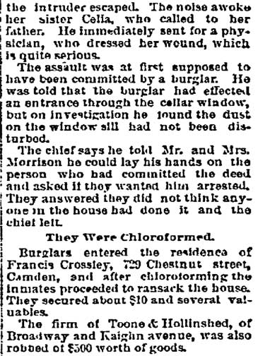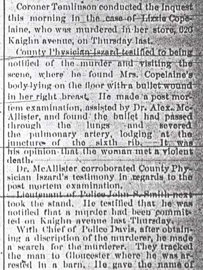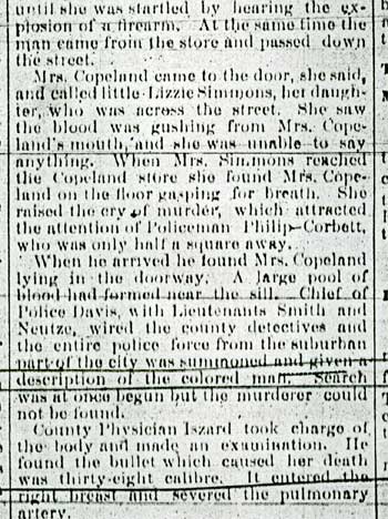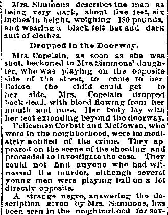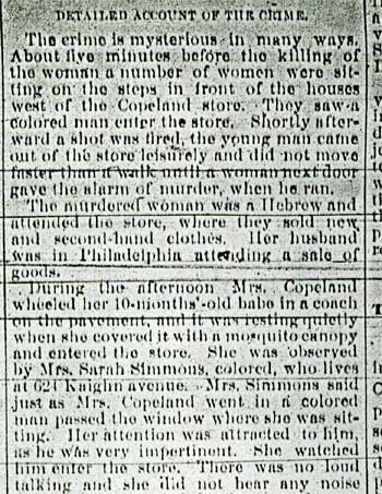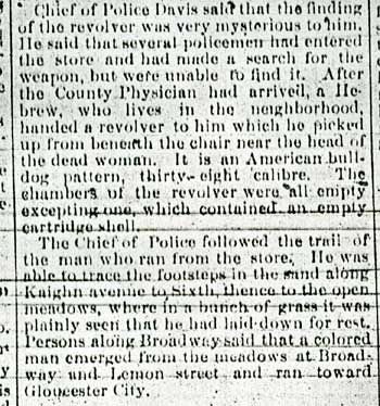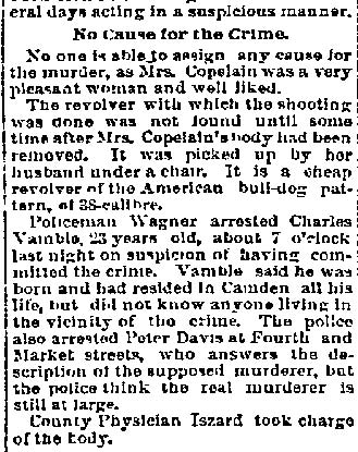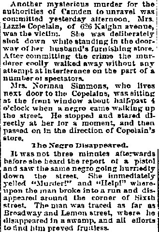 Mrs. Sarah Coplein, of 626 Kaighn Avenue was shot and instantly killed on Tuesday night by an unknown negro who entered the gents’ furnishing store kept by her husband and committed the deed without any motive. Mrs. Coplein was twenty-eight years of age. All that is absolutely known of the crime at present is told by Mrs. Simons of 624 Kaighn Avenue, who says she saw a negro of medium height enter Mrs. Coplein’s store, fire a pistol shot, and then run away across the meadows at Sixth street. County Physician Iszard held a postmortem examination and decided that death was due to a pistol bullet which penetrated the right breast. He ordered a Coroner’s inquest. Two colored men named Charles Vambel and Patrick Davis were immediately arrested on suspicion of having committed the brutal deed.. |
