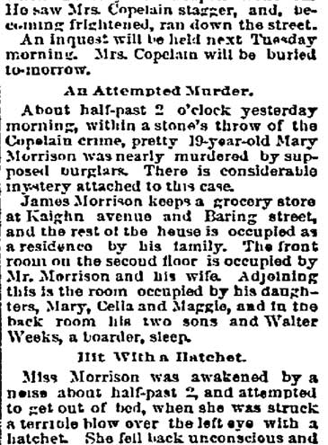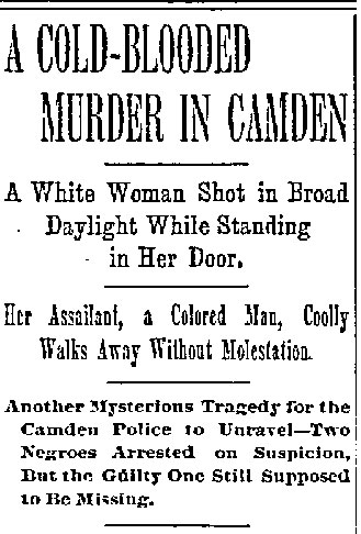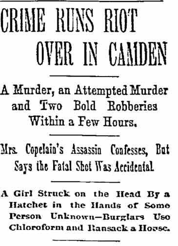 The brutal murder on Thursday night of Mrs. Coplein adds another to the already long list of Camden county crimes. It is sincerely hoped that the victim will not go unavenged. |