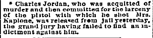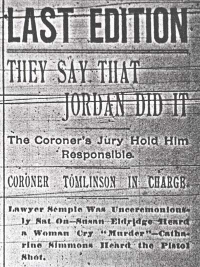 The Coroner’s jury in the Coplein murder has charged the negro Charles Jordan with the crime. Jordan has confessed to the deed of which he is accused and all that remains for the state to do is to legally determine the motive which prompted and the frame of mind which accompanied the homicide. Jordan, in admitting the shooting, declared that he had stolen a pistol from a saloon of which he was a habitué and carried it into the store for the purpose of disposing of it for money for a drink. Before going into the store he took the precaution to snap the hammer for the purpose of determining whether or not the weapon was loaded. Having satisfied himself that it was not he exhibited it to Mrs. Coplein and offered to sell it. Snapping it for the purpose of demonstrating the effectiveness of the spring of the pistol, it suddenly discharged, and Mrs. Coplein received a wound which proved fatal. This, in substance, is Jordan’s story. And it is significant that it is the “only” story which bears perfectly on the motive which prompted and the frame of mind which accompanied the act. The State’s officers profess to have evidence in their possession which tends to prove that their may have been bad feeling between the prisoner and Mrs. Coplein because of the robbing of her store some months ago, in which robbery the defendant was implicated, and for which he served a slight sentence in the county jail. It will require a mightier effort than that shown at most murder trials to pass sentence of death upon a man upon no better foundation than that. Jordan may have been a black-hearted murder. He may have entered the store of Mrs. Coplein with the sole and express purpose of shooting to death the victim of the tragedy. He may have been of such a vindictive mind as to require no greater motive to murder the defenseless woman than mere ill-feeling for causing his conviction of a crime. He may be all this and infinitely more, but so far as his counsel. Lawyer John Wartman well observes, there is no proof of the fact, for everything has been told of the shooting or of the motive comes from the defendant himself. The correct attitude for all intelligent citizens of the county is that judicial one which deems the defendant innocent until his guilt is judiciously proved. It is not only very suggestive of an ill-balanced mind to pass unqualified judgment on a partial or ex-parte state of facts, but not at all seemly in one who is called to do duty on trial jury which may have the deliverance of life and death in its behest. |