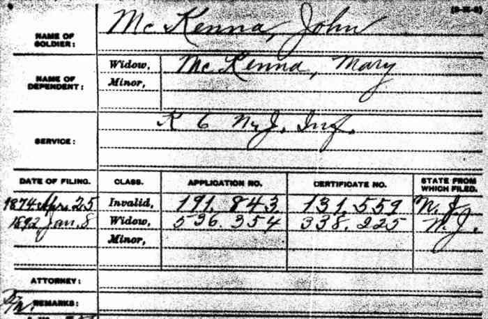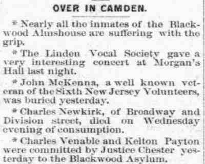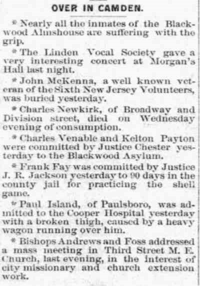 John McKenna and Family John McKenna appears to have come to Camden after the Civil War. There are no McKennas listed in the 1860 Census south of Burlington County, and the one family that was in Burlington County did not have a family member named John. What is known about John McKenna is that he was born in Pennsylvania around 1819, and that his father's name was James. By 1857 he had married, and that year she gave birth to a son, thomas, and another son, Daniel followed in less than two year's time. Both sons were born somewhere in New Jersey. John McKenna served as a member of Company K, 6th New Jersey Volunteer Infantry (also called the "6th New Jersey Volunteers"), enlisting as a Private on August 9, 1861 and mustering out as a Corporal in February 12, 1864. The 6th New Jersey Volunteer Infantry was recruited in the counties of Burlington, Camden, Mercer, Hudson and Hunterdon, and was mustered into Federal service in August 1861. John McKenna is likely to have come from one of the three northern counties, and like many others, have come to Camden after leaving the military to take advantage of the economic opportunities there. It is unclear as of this writing where John McKenna and family lived after the Civil War. Twins Mary and John F. McKenna were born in June of 1869. John McKenna first appears in Camden City Directories in 1870, residing at "117 Firing's Alley" in 1870 and on "Furon's Court below 2nd Street" in 1872. The Directories are undoubtedly referring to Fiering's Court, which by 1885 no longer appeared on Sanborn maps for Camden. Fiering's Court was a short street that lay south of stevens street and west of Second Street. The Camden Tool and Tube works is shown in 1885 standing on the north side of what had had been Fiering's Court. No homes or buildings then are shown to have been standing on the north side. John McKenna filed for his Civil War invalid's pension on April 25, 1874. From 1878 through 1885 the McKenna family is listed in Directories at 708 South 2nd Street. John McKenna worked as a paver. The 1880 Census also has them at that address, the family consisting of John and Mary McKenna, sons thomas, 22, Daniel, 21, John, 11; and daughter Mary, 11. Thomas had gone to work at Camden Tool and Tube Works, while Daniel worked as a laborer. The twins were attending school. The older McKenna sons worked at different jobs through the early to mid-1880s, Daniel primarily a blacksmith. Thomas McKenna worked a number of occupations including two years as a member of the Camden Fire Department, serving as as an extra man with Engine Company 1 beginning April 5, 1882. He replaced Charles Sawyer and was replaced in turn by by Frank Webster. Not long after the