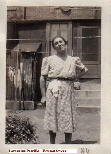 Lorenzina Petrillo "My grandparents, their 6 sons and one daughter lived on Benson Street from about 1920 thru 1957, Lorenzina and Anthony Petrillo, Rose Petrillo DiMassimo (her husband Joseph), John, James, Michael, Frank, Tony and Gus. My grandmother was known for having some of the best tomato plants on Benson Street. She was also an excellent seamstress and her son Michael grew up to own Esquire Tailors on Westfield Avenue. "