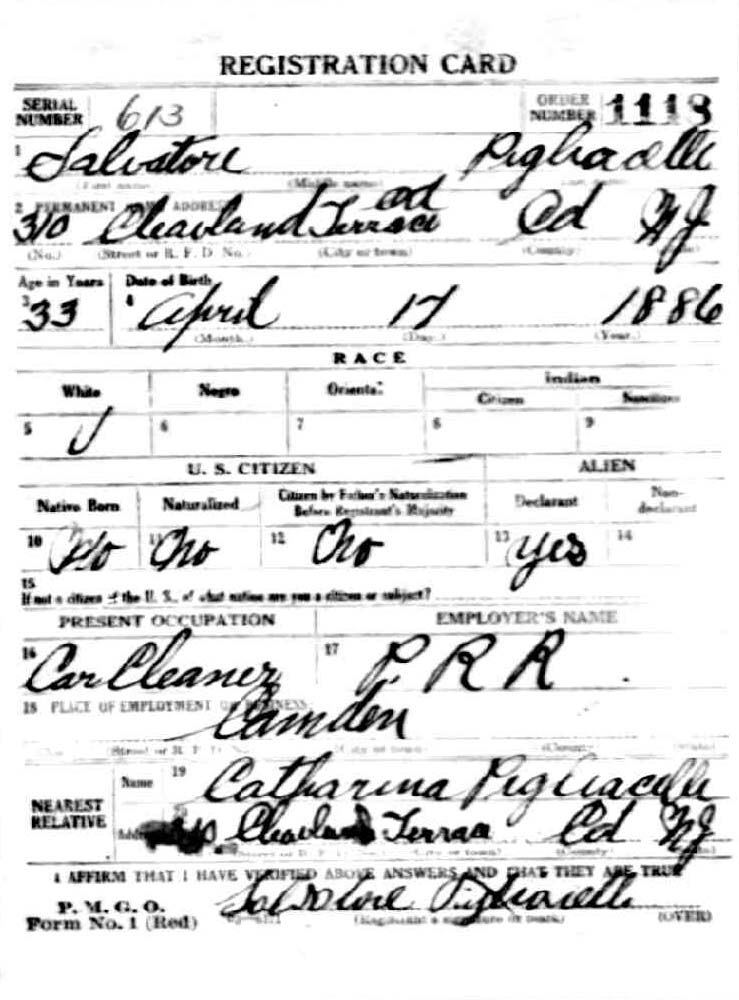 Salvatore Pigliacelli's World War I Draft Card - September 12, 1918 | |