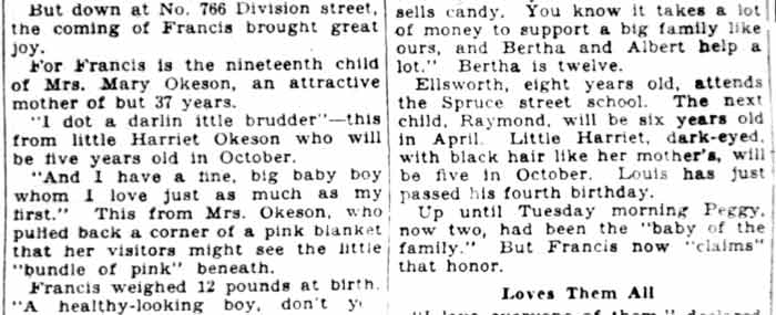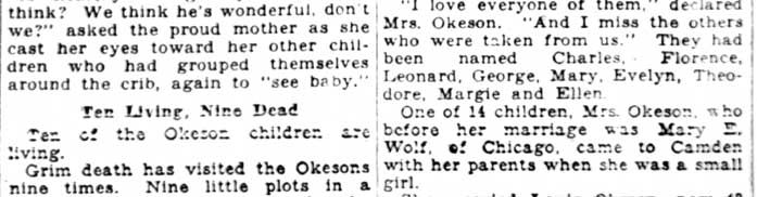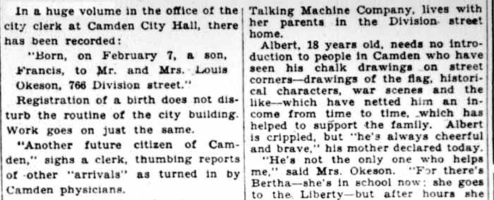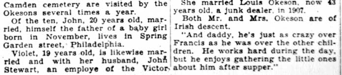 I came across this article in the February 10, 1928 edition of the Camden Evening Courier, the afternoon version of the Courier-Post newspapers, the morning one being the Morning Post. I figure there has to be more to wrote on this large family, so I've posted the article. Perhaps someone in the family will find this and we can continue the saga. June 23, 2005 |
