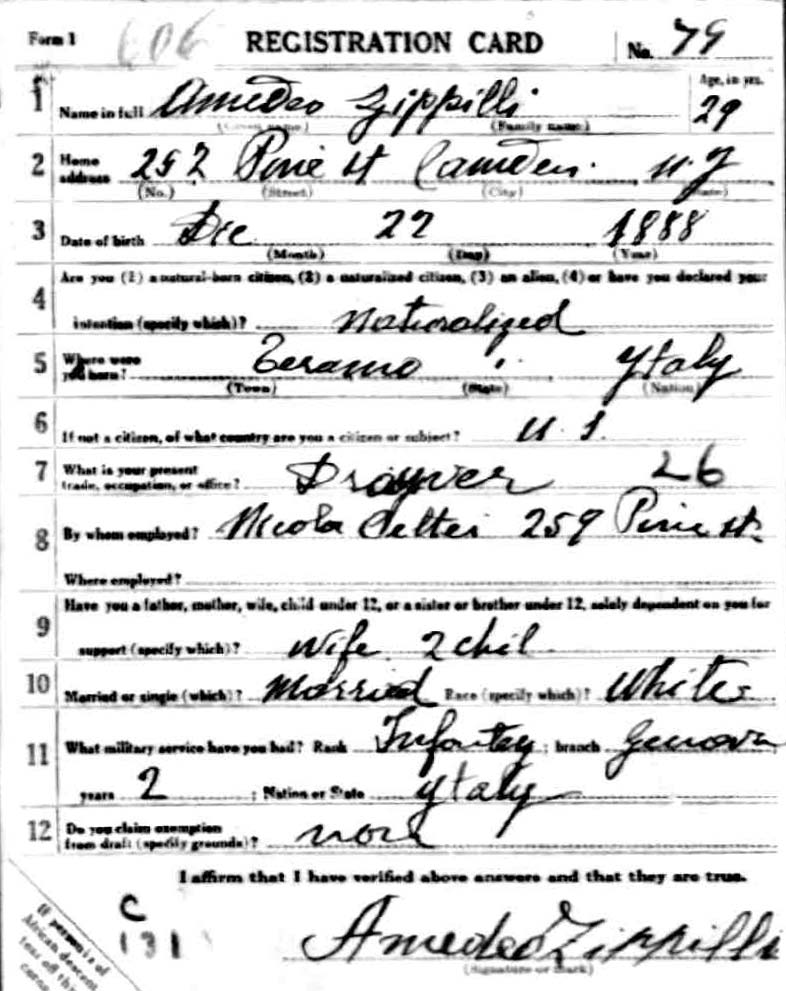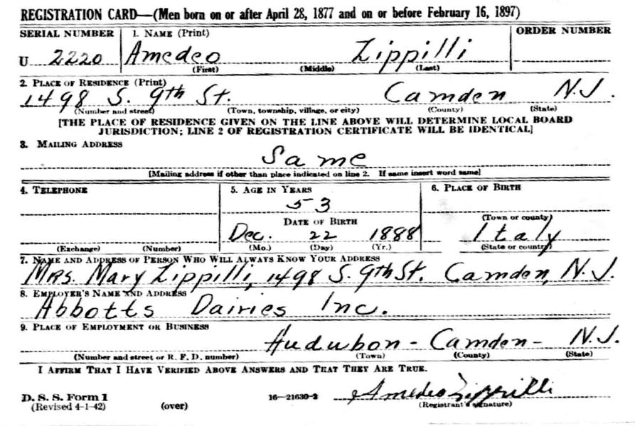 World War II Draft Card - Amedeo Zippilli - 1942 |