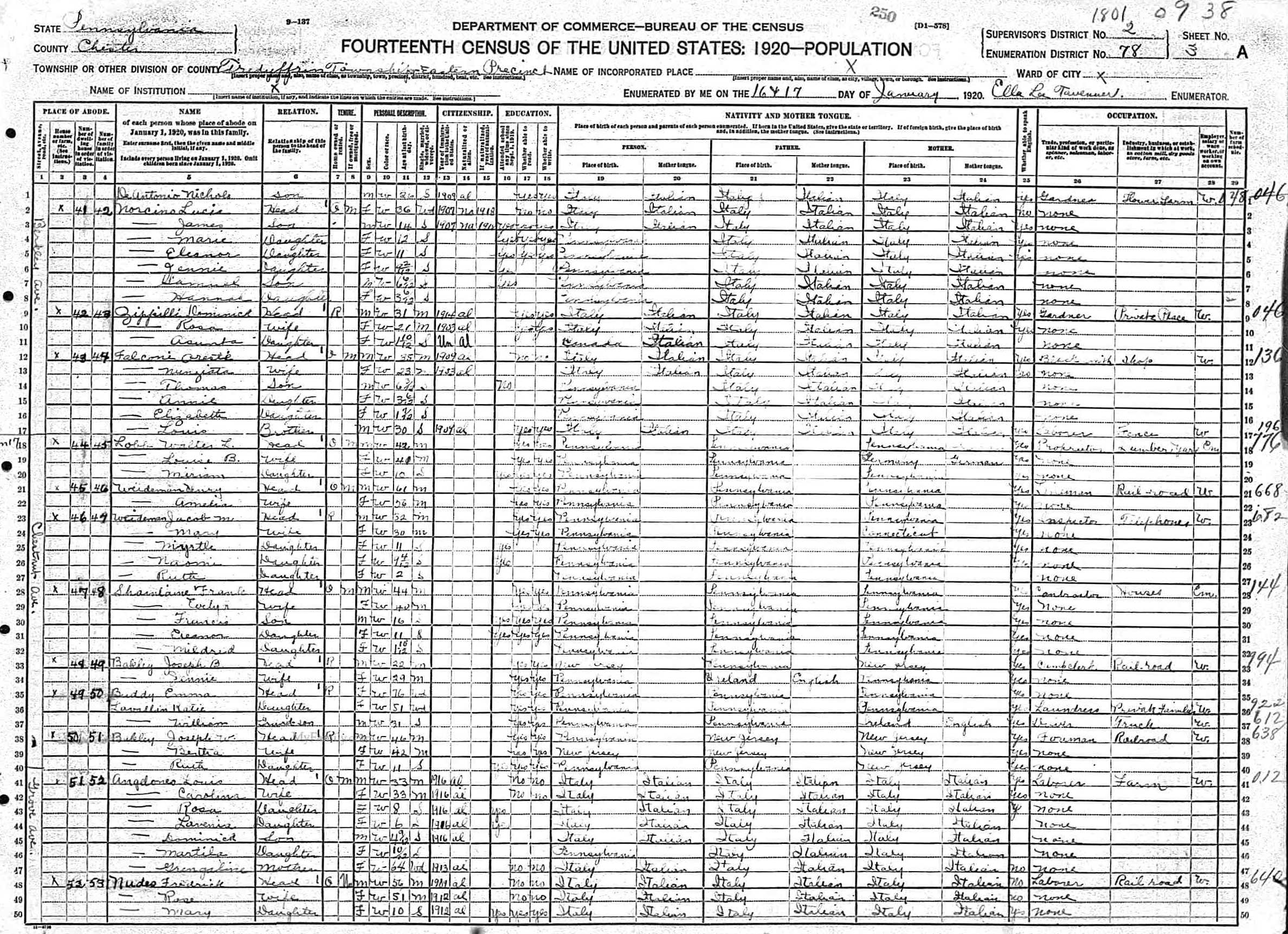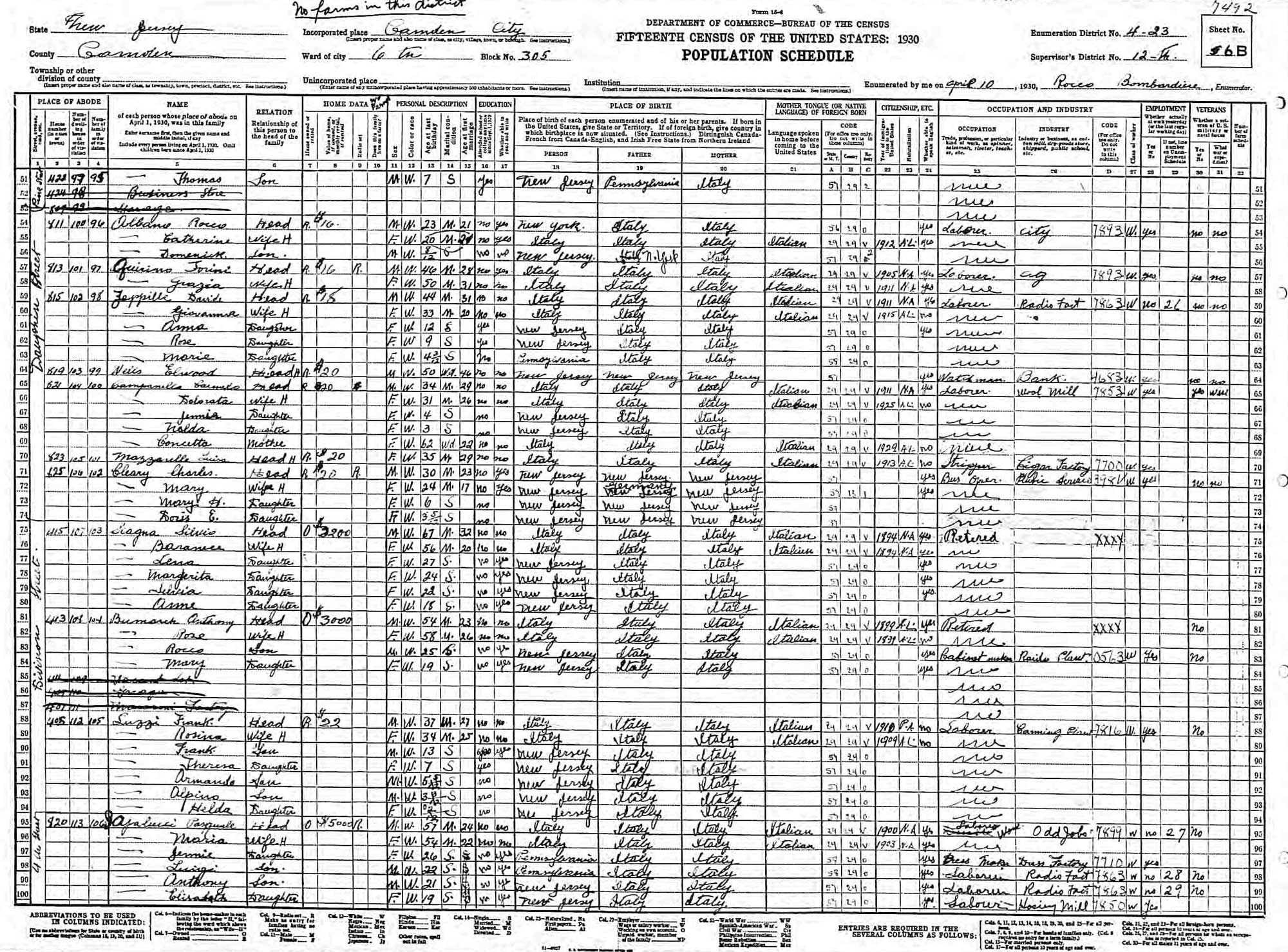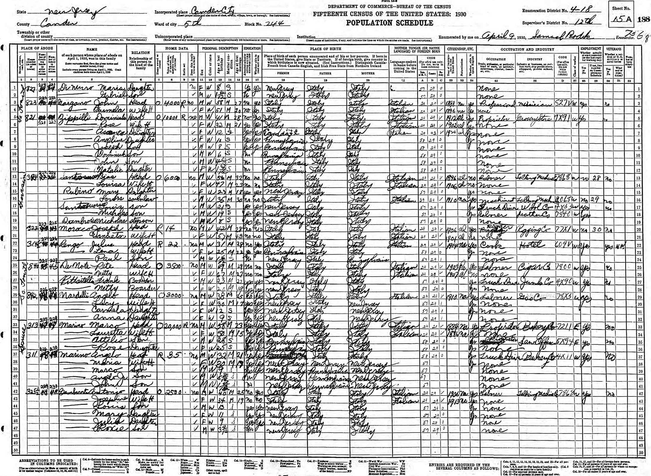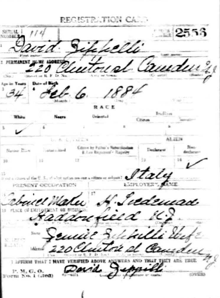 The beginning of the story of the Zippilli family in Camden is somewhat shrouded, as all the records regarding their arrival in the USA and moves to Camden are not at hand. However, using what has been found through on-line sources and Camden City Directories, and with a good bit of help, one can proceed with confidence that a fairly accurate reading of the facts can be given. Amedeo Zippilli arrived in the United States in 1910, according to Census records. His brother David and first cousin Domenico arrived in 1914, also according to Census records. Draft Cards for the three men indicate that by June of 1917 the two brothers had married women they had met in America, and had settled in Camden, New Jersey. Amedeo lived at 252 Pine Street, while his brother made his home at 220 Clinton Street. Their cousin Domenico had gone to Devon, Pennsylvania and had married Rosa DeAscentiis. The 1920 Census shows that Domenico and Rosa, who had come to the United States in 1903, were living in Trediffryn Township, in Chester County, Pennsylvania. The young couple apparently had spent some time in Canada, as Rosa Zippilli gave birth to their first child, a daughter, Assunta, there in 1918. Regarding the two Zippilli brothers, the 1920 Census reveals that Amedeo and David Zippilli, their wives and children were all living in a home at 342 Line Street in South Camden. Both men worked in shipyards, Amedeo as a laborer, while David as a shipyard carpenter. Amedeo on Maria Zippilli then had four children- Domenick, Vincent, Rosie, and Felix. David and Jenny Zippilli then had one daughter, Anna- two more would follow, Rose and Marie. The 1924 Camden City Directory shows that Amedeo Zippilli was still working as a laborer and living at 342 Pine Street. By 1927 he had gone into business, operating a grocery store at 821 South 4th Street, which he ran through the time the 1929 Camden City Directory was compiled. Shortly afterwards he sold the building and the business to his cousin Domenico, who had been living in Pennsylvania. When the Census was taken in April of 1930, Domenico and Rosa Zippilli were living at 821 South 4th Street with six of their children. Five more would follow. The Zippilli children and the year of their birth are as follows: