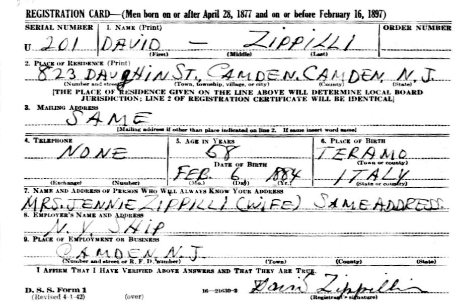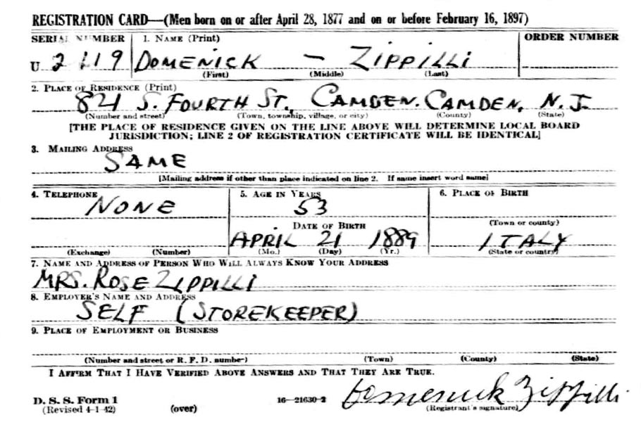 World War II Draft Card - Domenico Zippilli - 1942 |