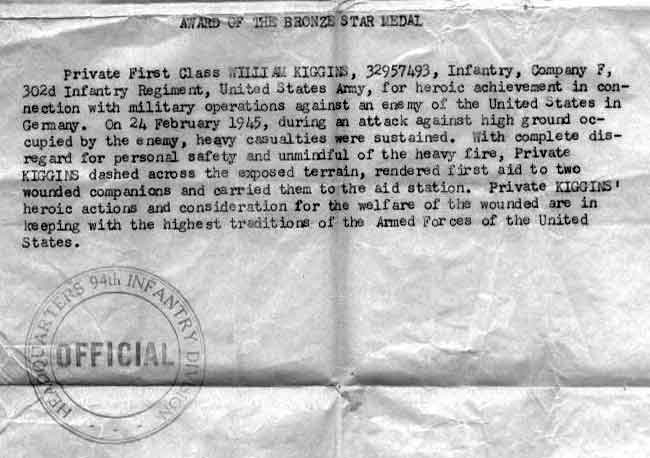 When the Germans attacked in the Ardennes in December of 1944, the need for infantry replacements became critical. Support units were stripped of men, and William Kiggins, by this time promoted to Private First Class, was sent to Company F, 302nd Infantry Regiment, 94th Infantry Division. Activated on September 15, 1942, at Ft. Custer, Michigan, the 94th Infantry Division left New York on August 1944, stopped in Great Britain and finally landed in the Utah-Beach-section, Normandy, on September 8, 1944. Until January 1, 1945, she stayed in the area of Lorient and St. Nazaire until she got released by 66th Infantry Division. On Jan 7, 1945, she relived the 90th Infantry Division, south of Wasserbillig, Germany, and entered the Saar-Moselle-Triangle. Through fierce fights the 84th advanced through Tettingen and Butzdorf to Nennig but had to retreat a couple of times, at Orscholz January 20, at Berg on January 23-25, and at Campholz on February 15. Supported by heavy artillery and air support the division attacked with her three regiments and broke thru the Siegfried Line and following 10th Armored Division she cleared the Saar-Moselle-Triangle south of Orscholz and Saarbrug until Feb. 21, 1945. Under heavy German fire they crossed the Saar River and built two bridge heads, one near Ockfen on February 22 and one near Serrig-Taben shortly afterwards. Fierce fights began but the bridge heads could be united and a heavy bailey bridge was build near Saarburg on February 26, 1945 During the .fighting at the Serrig-Taben bridgehead Private First Class William Kiggins rescued two wounded men for which he was awarded the Bronze Star.