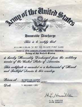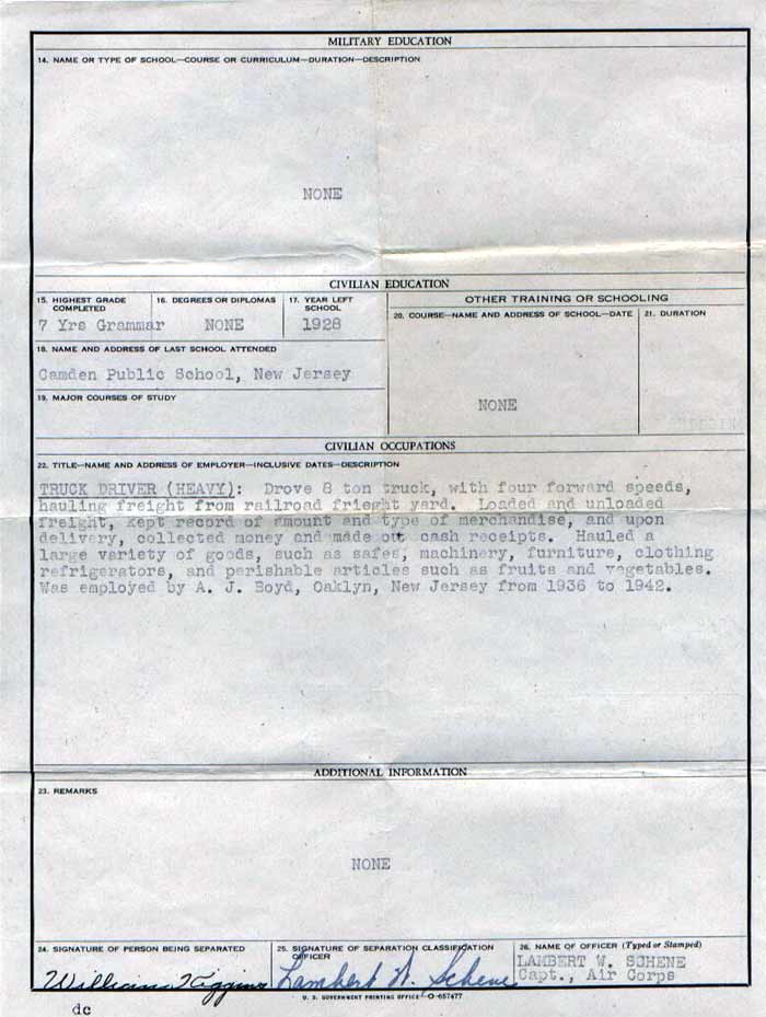 William Kiggins was born on May 11, 1912 to James and Dorothy Lee Minner Kiggins in Camden NJ. He was the second of three children, coming after brother James, and before sister Nettie Kiggins. By 1920 his father had passed away. At the time of the 1920 census the family lived at 513 Washington Street, just off of Broadway. Dorothy Kiggins was supporting her family as a finisher in one of Camden's leather works. Older brother James, 14 at the time, was working as an errand boy in a local store. William Kiggins attended grammar school in Camden, but left in 1928 after completing the seventh grade, to go to work. By April of 1930 Dorothy Kiggins and her two younger children were living in a rented house at 828 Kimber Street. Dorothy Kiggins was working odd jobs, and William, then 18, had gone to work as a spinner at a wool mill in Camden. Sister Nettie was not working then, presumably she was still in school. Dorothy Kiggins also let a room to a man named Edward Gaunt, who was a machine operator at the Armstrong Cork Company in Camden. William Kiggins had gone to work in the 1936 as a truck driver for the A.J. Boyd Company in Oaklyn NJ. His discharge papers stated that he "drove an 8 ton truck, with four forward speeds, hauling freight from railroad freight yard. [He] loaded and unloaded freight, kept record of amount and type of merchandise, and upon delivery, collected money and made out cash receipts. Hauled a large variety of goods, such as safes, machinery, furniture, clothing, refrigerators, and perishable articles such as fruits and vegetables." On May 17, 1941 William Kiggins and Irma Laura alter were married in Maryland. Their first child, William Jr., was born in the spring of 1943. William Kiggins Sr. was still working for the A.J. Boyd Company when he received his draft notice on September 6, 1943. The Kiggins family during this time made their home at 938 Penn Street in Camden, not far from where his mother lived. William Kiggins Sr. reported for active duty in the United States Army on September 27, 1943. After completing basic training, Private Kiggins qualified as a rifleman on December 10, 1943. He performed various duties while in service, as a light truck driver, rifleman, and as an MP. He was sent overseas in May of 1944 as part of the 1st Provisional Trucking Company. According to his separation qualification record he "drove a 2 1/2 ton truck, hauling military equipment from seaport to quartermaster depot. Drove in convoys, hauling crated military vehicles and truck parts. Hauled military personnel. Performed minor emergency repairs such as changing tires, adjusting motor and lubricating parts. Served in England and Scotland with headquarters detachment, First Provisional Trucking Company.